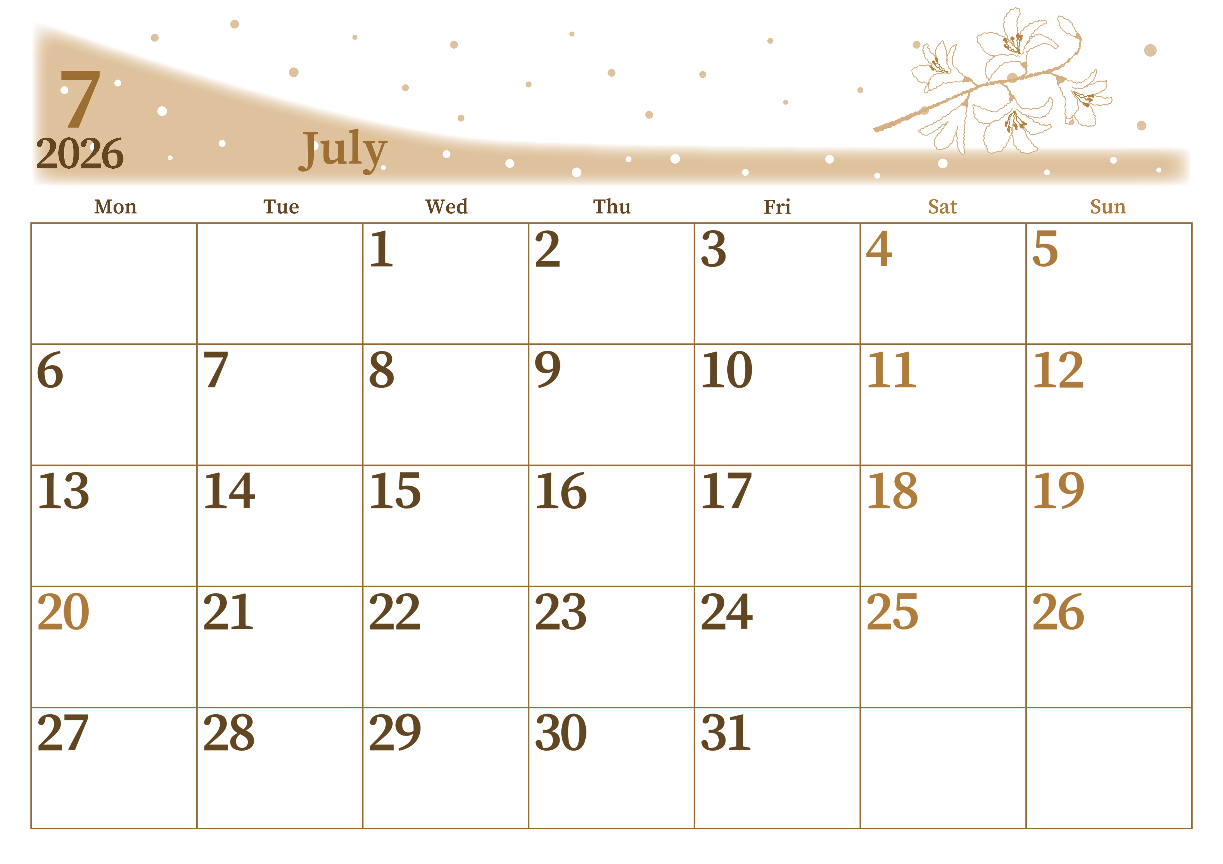 2026年7月横型レトロな月曜始まりの無料テンプレートセピア調カレンダーです。月曜始まりなだけでなく予定を記入するエリアが広いので実用性が極めて高いセピア調カレンダーです。白ユリのイラストもおしゃれでスタイリッシュです。(2026-00650701)