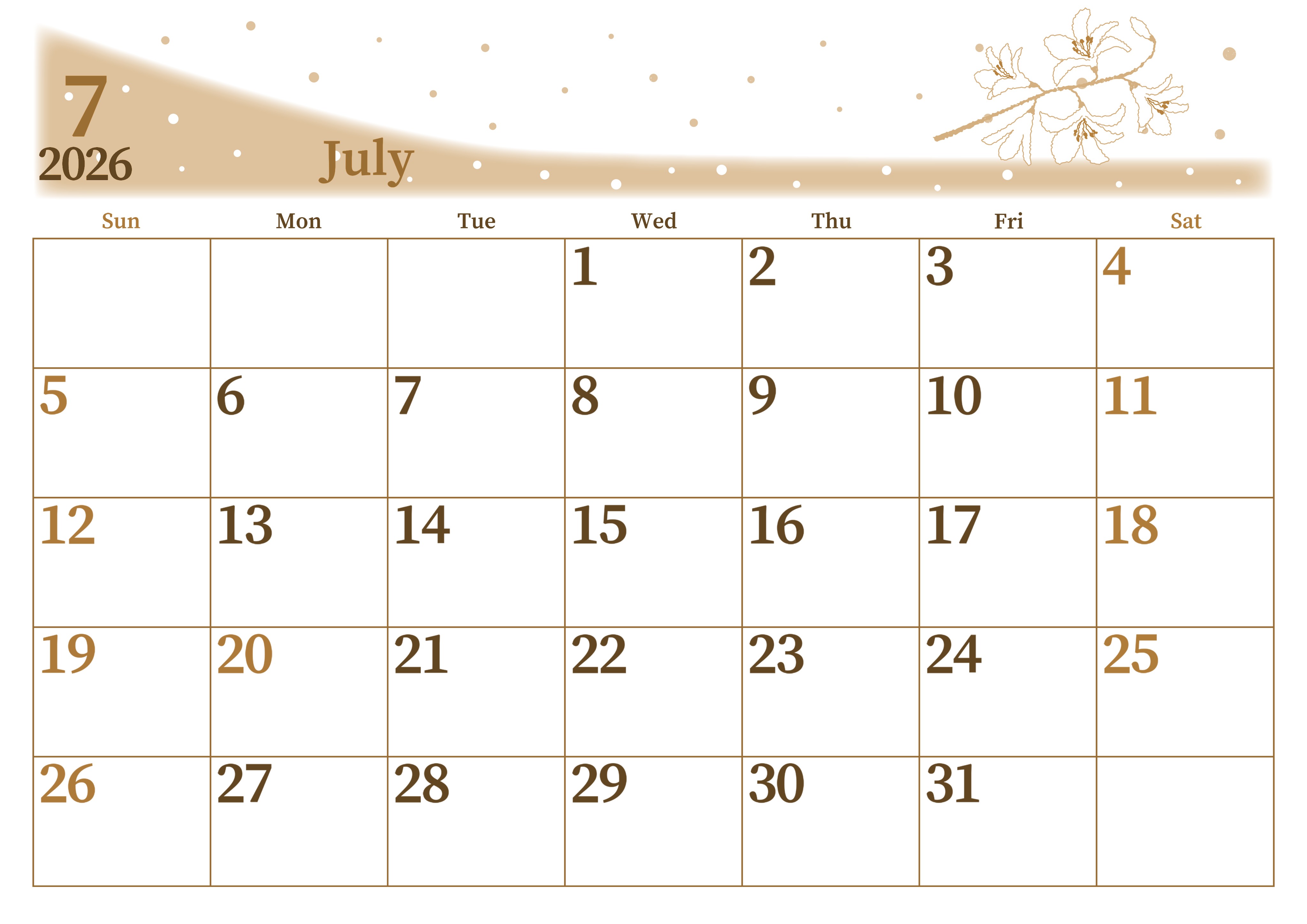 2026年7月横型レトロな日曜始まりの無料テンプレートセピア調カレンダーです。白ユリが添えられている様子がおしゃれで大人っぽいデザインのシンプルイラストセピア調カレンダーです。手書きがしやすいので印刷利用をおすすめします。(2026-00650700)