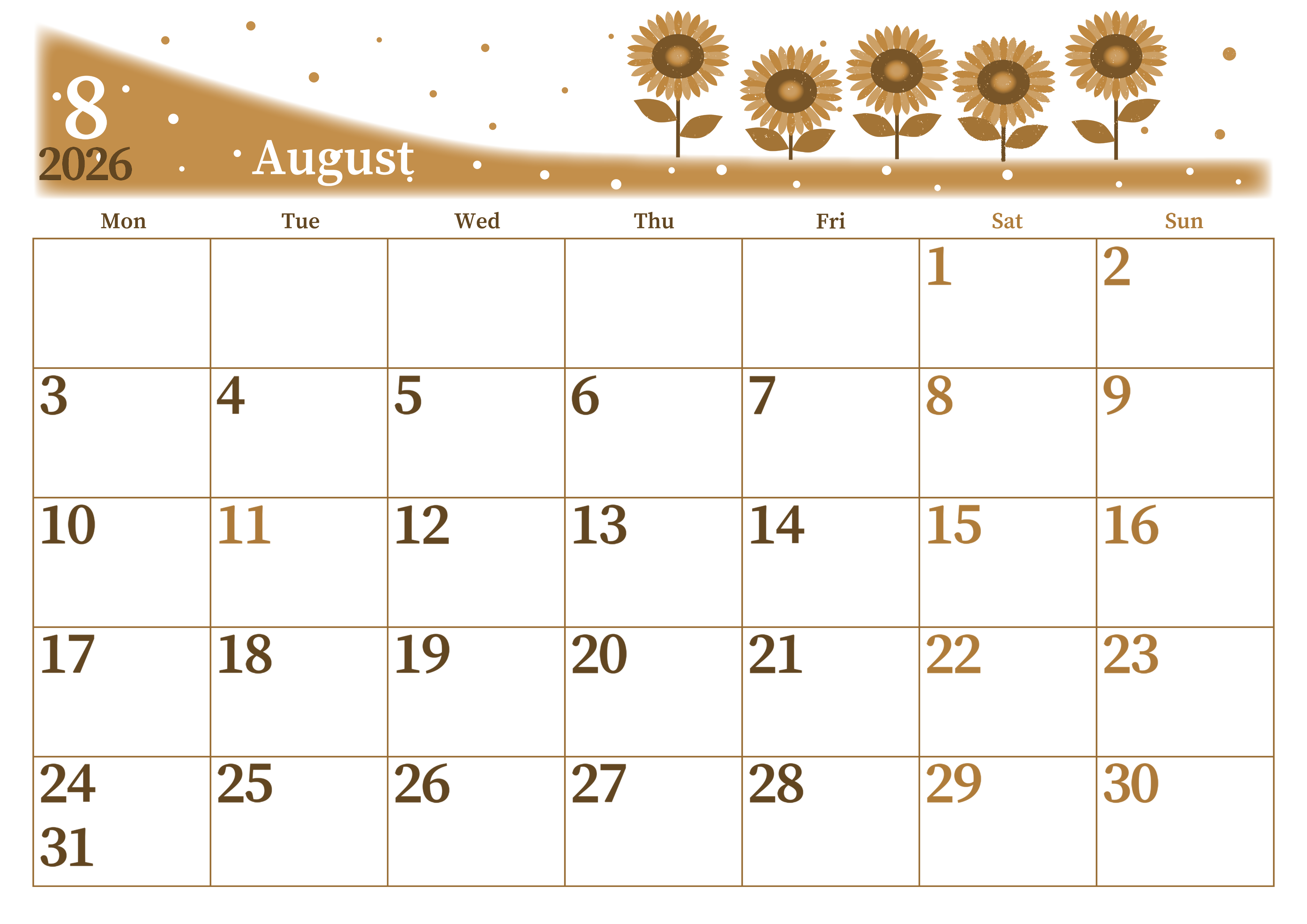 2026年8月横型レトロな月曜始まりの無料テンプレートセピア調カレンダーです。月曜始まりでA4白紙に印刷すればすぐに使える手頃なセピア調カレンダーです。季節の花のかわいいイラストが夏を感じさせてくれます。(2026-00650801)