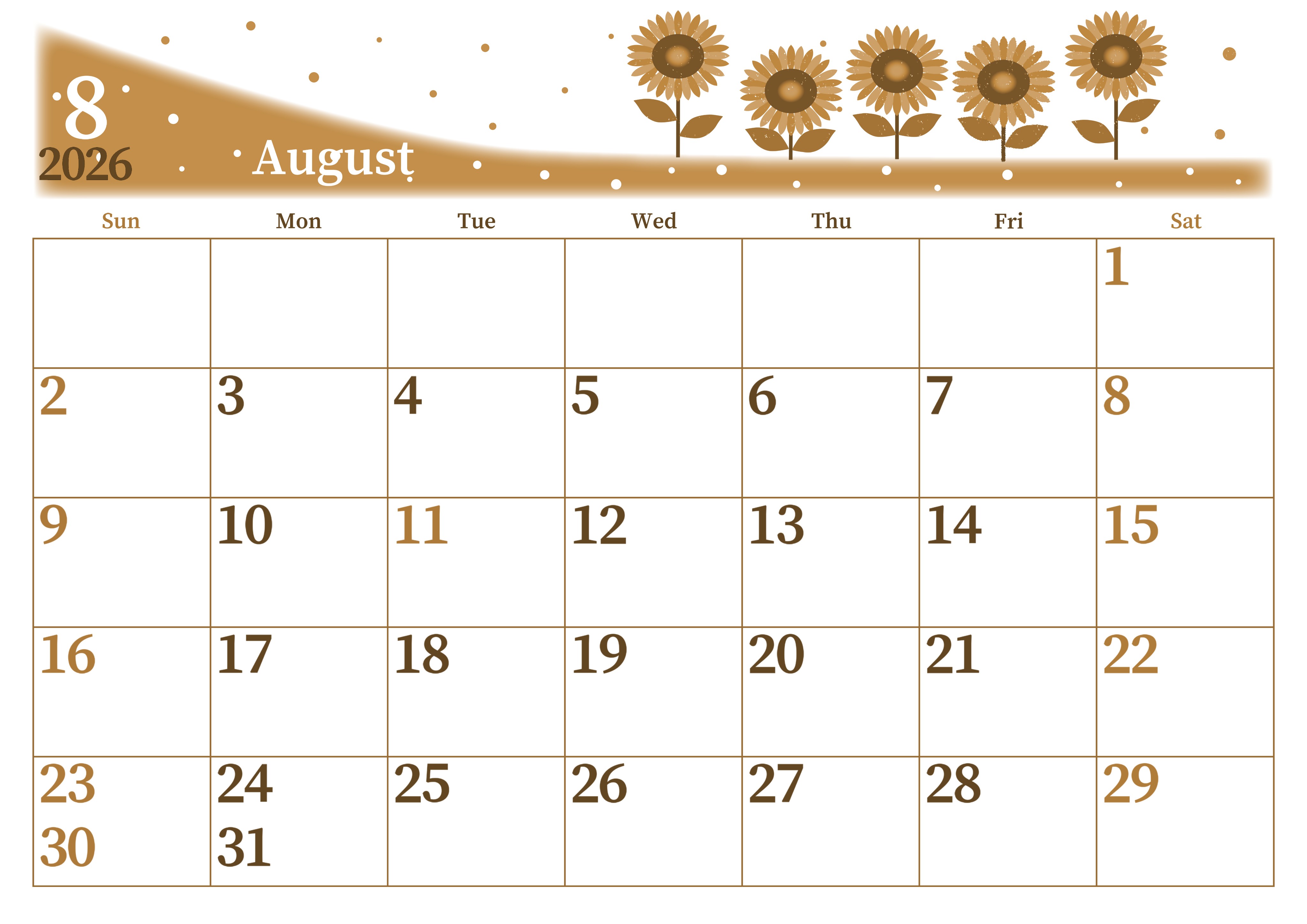 2026年8月横型レトロな日曜始まりの無料テンプレートセピア調カレンダーです。8月の季節の花を描いたシンプルでありながらもかわいいユーザビリティの高いタスク管理に向いているセピア調カレンダーフォーマットです。(2026-00650800)