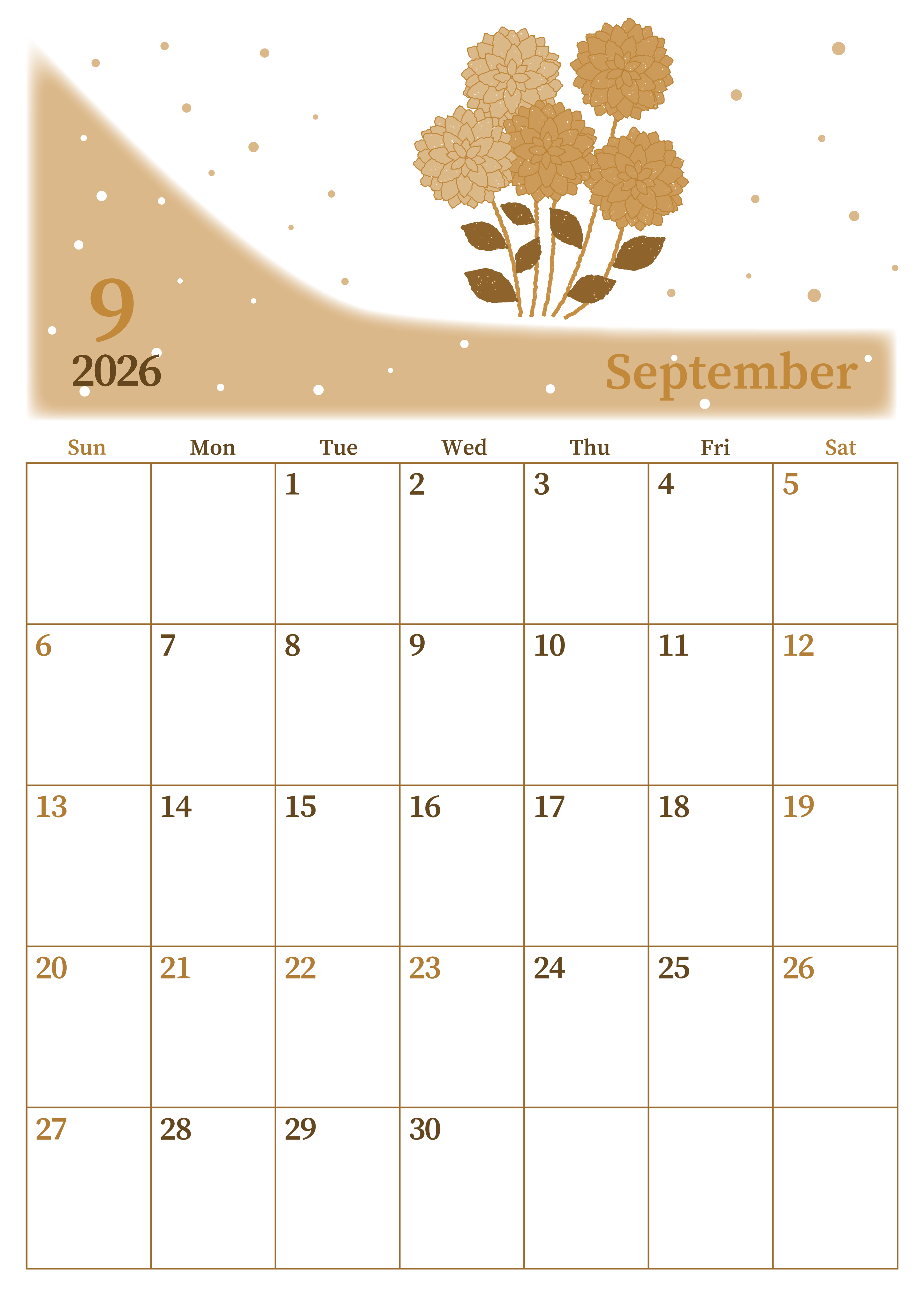 2026年・無料のカレンダーテンプレート 2026年9月縦型レトロな日曜始まり マリーゴールドがおしゃれなイラストA4無料セピア調カレンダー(2026-00650910) 素材状デザイン王 2025年4月2日 2026年9月縦型レトロな日曜始まりの無料テンプレートセピア調カレンダーです。マリーゴールドの組み合わせがおしゃれかわいい季節感が漂っているイラストとなっています。いい匂いがしてきそうです。(2026-00650910) 9月 縦型のカレンダー 日曜始まり セピア カレンダーデザイン-0065