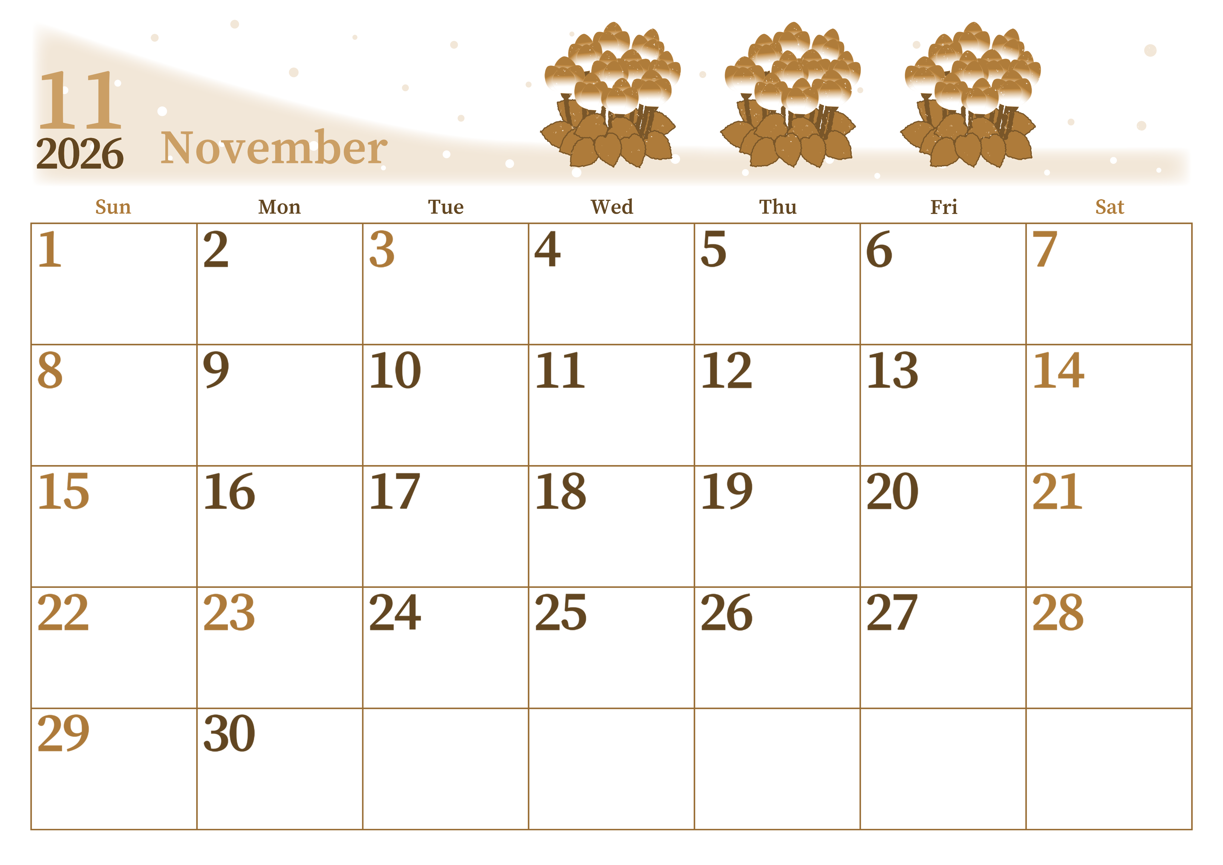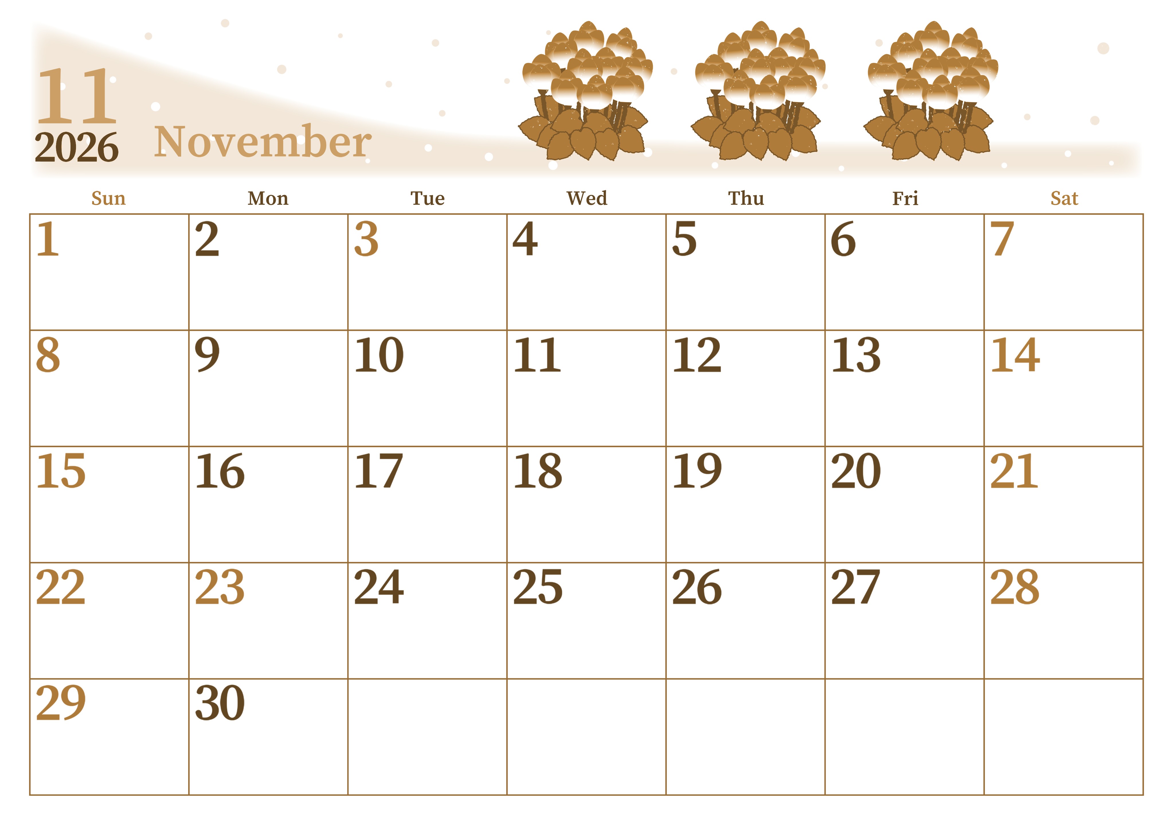 2026年11月横型レトロな日曜始まりの無料テンプレートセピア調カレンダーです。濃いめのシクラメンがはっきりとしていておしゃれでスタイリッシュなイラストとなっています。余白がたっぷりなので大きな文字で書き込めます。(2026-00651100)