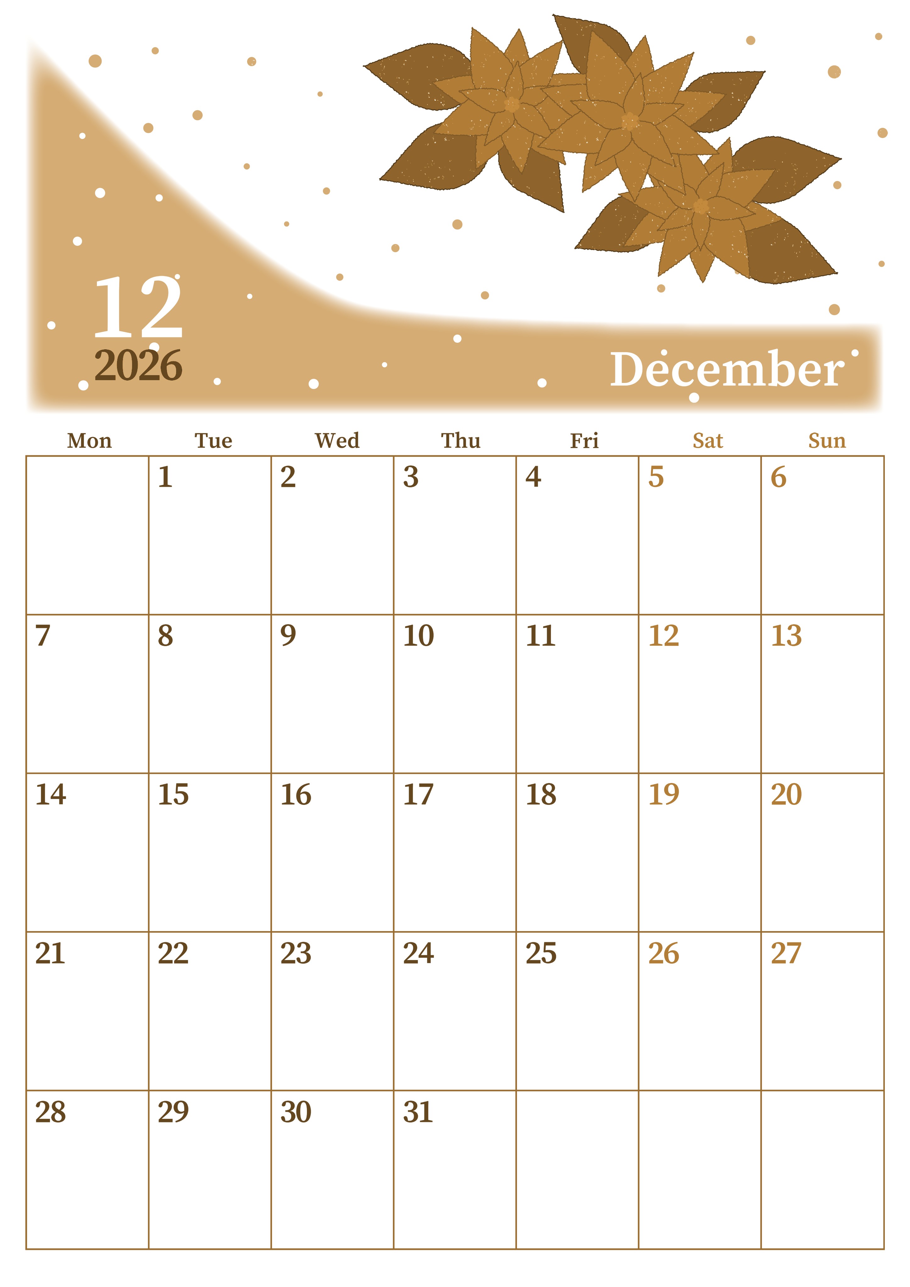 2026年12月縦型レトロな月曜始まり ポインセチアがおしゃれなイラストA4無料セピア調カレンダー(2026-00651211)
