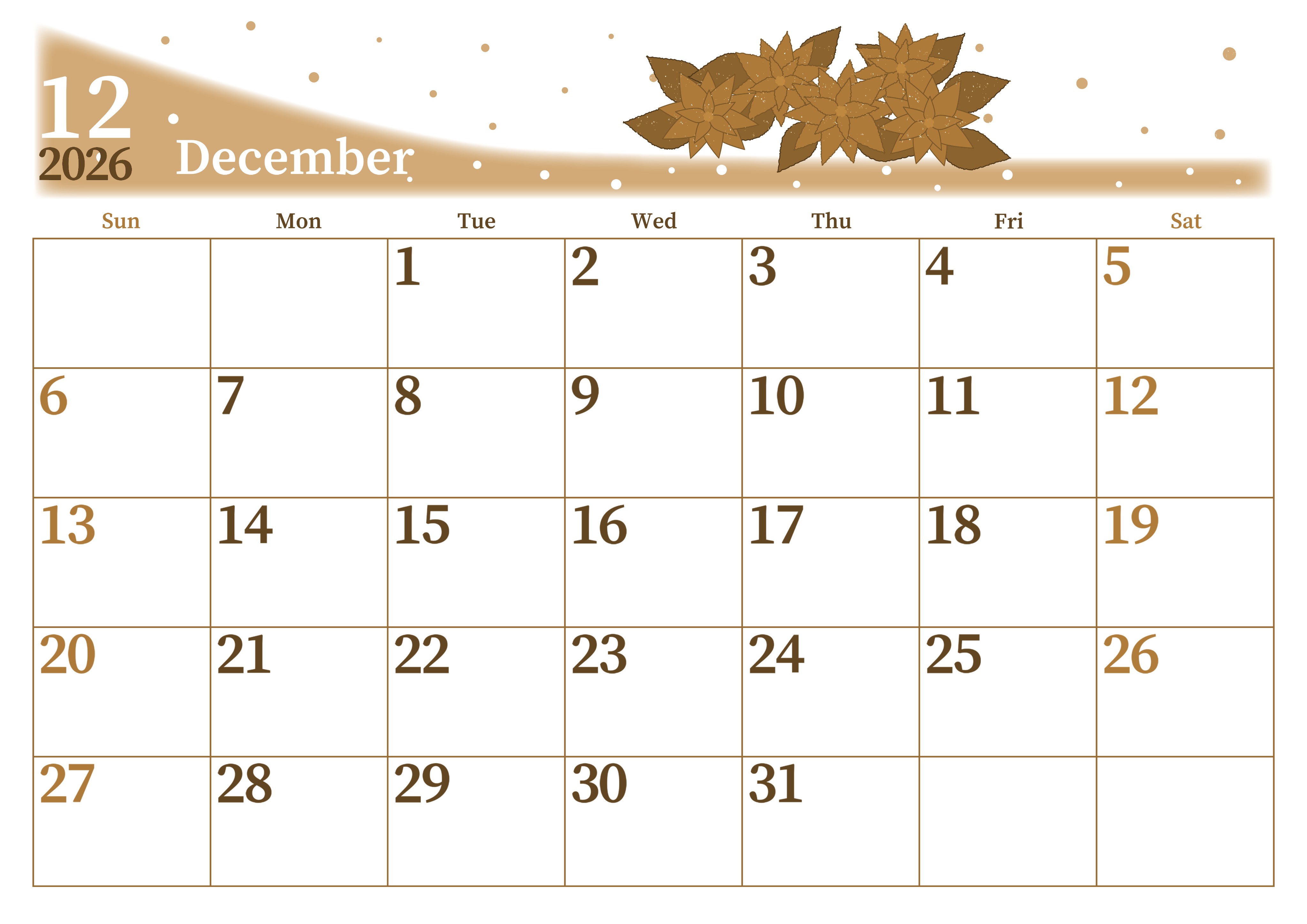 2026年12月横型レトロな日曜始まりの無料テンプレートセピア調カレンダーです。ポインセチアがおしゃれなイラストです。白い箇所が多いのでプリンターのインクを使いすぎるという心配もないので実用的です。(2026-00651200)