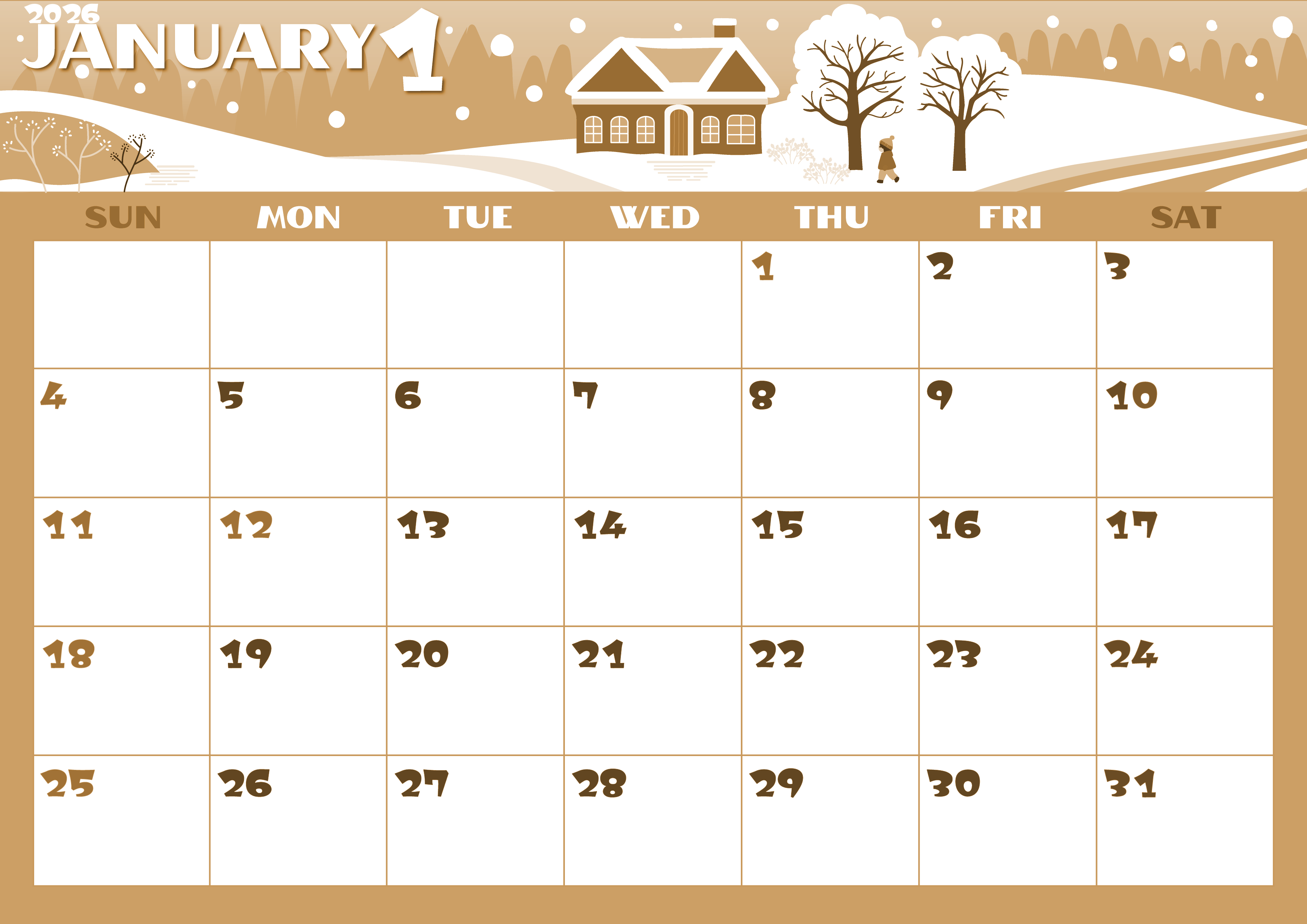 2026年1月横型レトロな日曜始まりセピア調カレンダーです。落ち着いたカラーリングで北欧を感じさせる真っ白な雪と風景のマッチングがおしゃれなだけでなく曜日の色分けも明確で見やすいのでダウンロードをおすすめする無料セピア調カレンダーです。(2026-00660100)