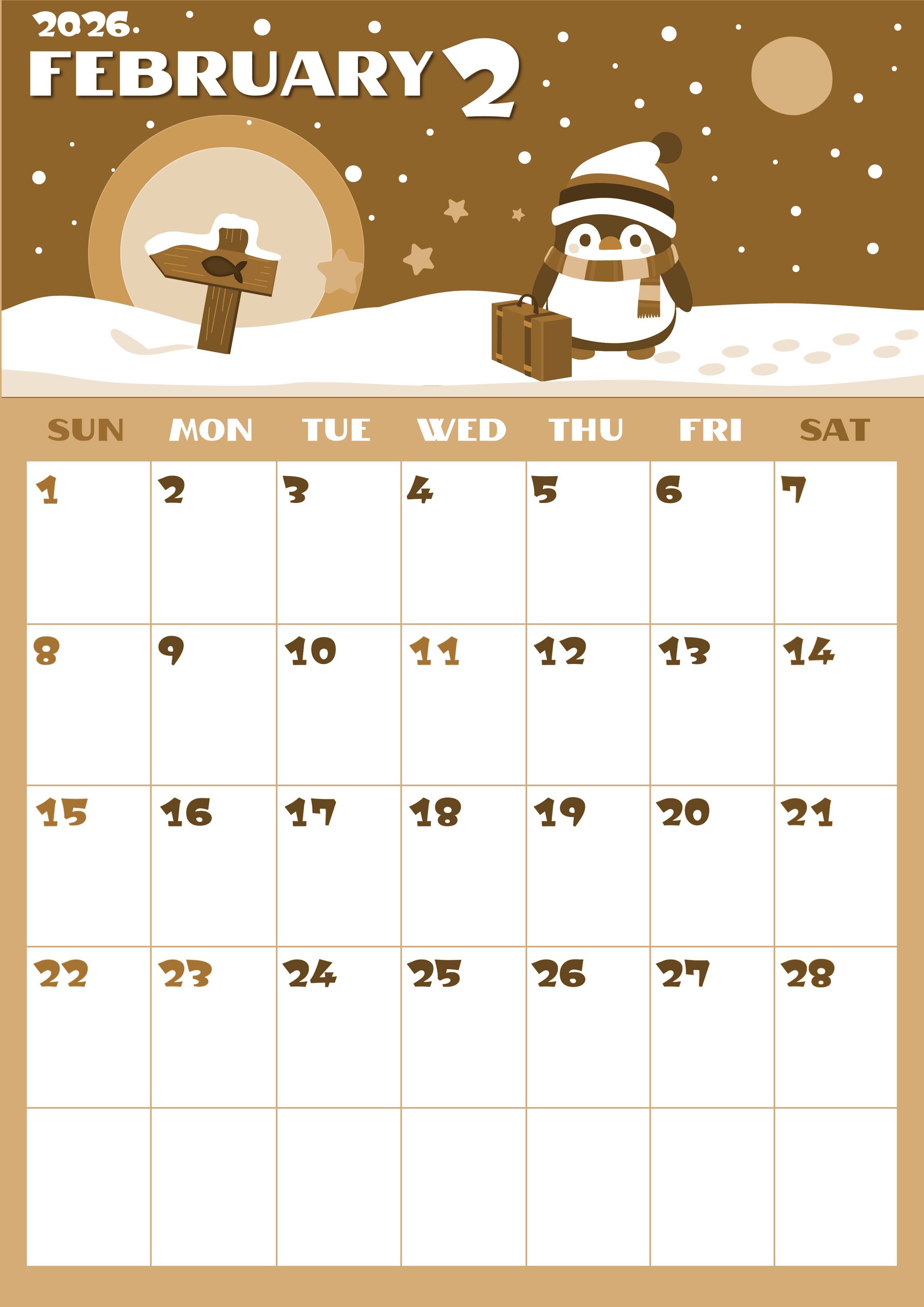 2026年2月縦型レトロな日曜始まりセピア調カレンダーです。セピア調カレンダー中央上部にペンギンがちょこんと佇んでいる様子がとてもかわいいイラストです。風邪が心配な冬ですがペンギンちゃんを見習って防寒しましょうね(2026-00660210)