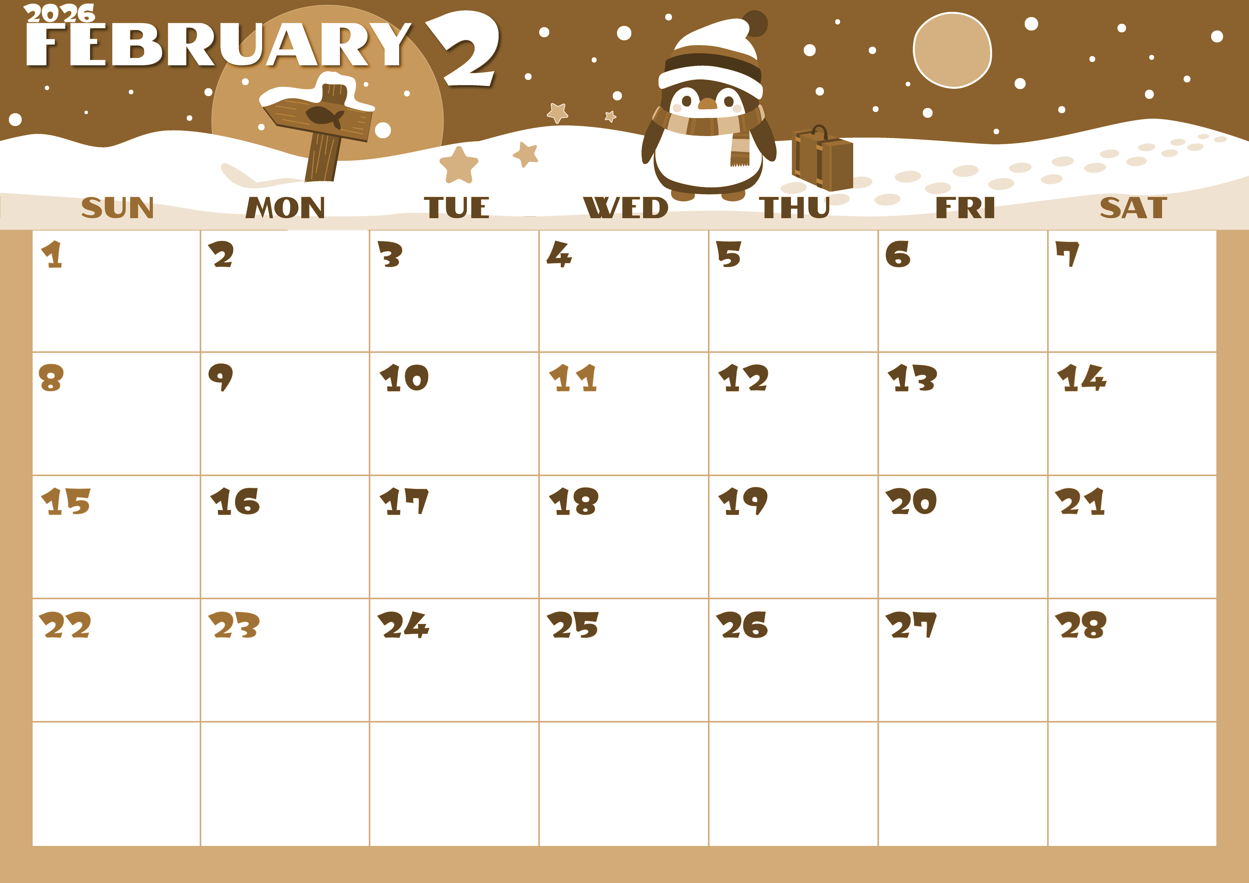 2026年2月横型レトロな日曜始まりセピア調カレンダーです。ペンギンがマフラーやウールの帽子で完全防寒対策をしているかわいいイラストです。セピア調カレンダーに使われている文字はポップで飛び出してきそうです。(2026-00660200)