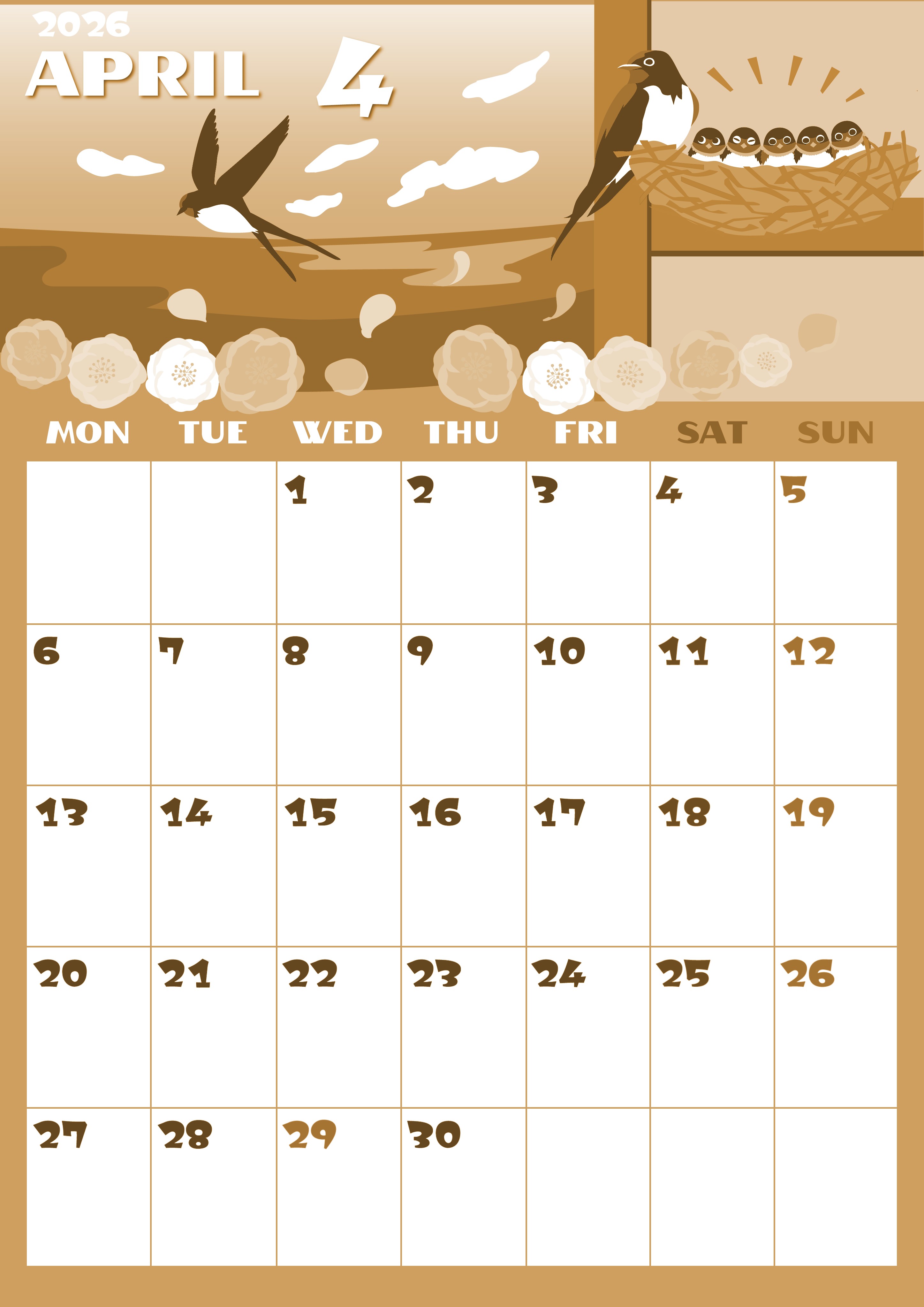 2026年・無料のカレンダーテンプレート 2026年4月縦型レトロな月曜始まり ツバメのイラストがかわいいA4無料セピア調カレンダー(2026-00660411) 素材状デザイン王 2025年4月2日 2026年4月縦型レトロな月曜始まりの無料テンプレートセピア調カレンダーです。ツバメのかわいいイラストが目を引きます。月曜始まりのセピア調カレンダーを欲しい人におすすめです。(2026-00660411) 4月 縦型のカレンダー 月曜始まり セピア カレンダーデザイン-0066