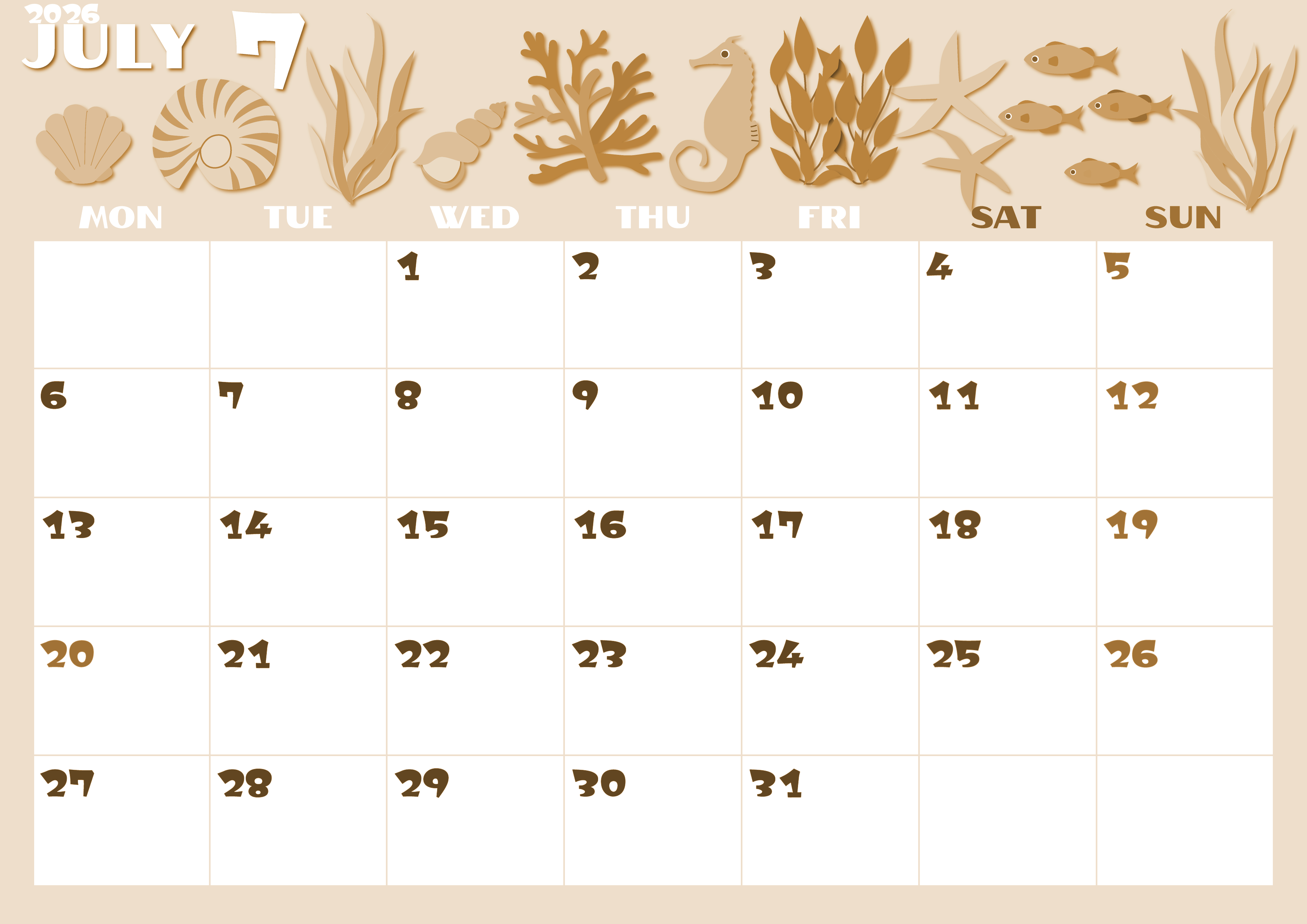 2026年7月横型レトロな月曜始まりの無料テンプレートセピア調カレンダーです。月曜始まりで行事や予定の管理がしやすいセピア調カレンダーです。イラスト部分には海水浴に行きたくなるようなかわいい海の生き物が大きく描かれています。(2026-00660701)