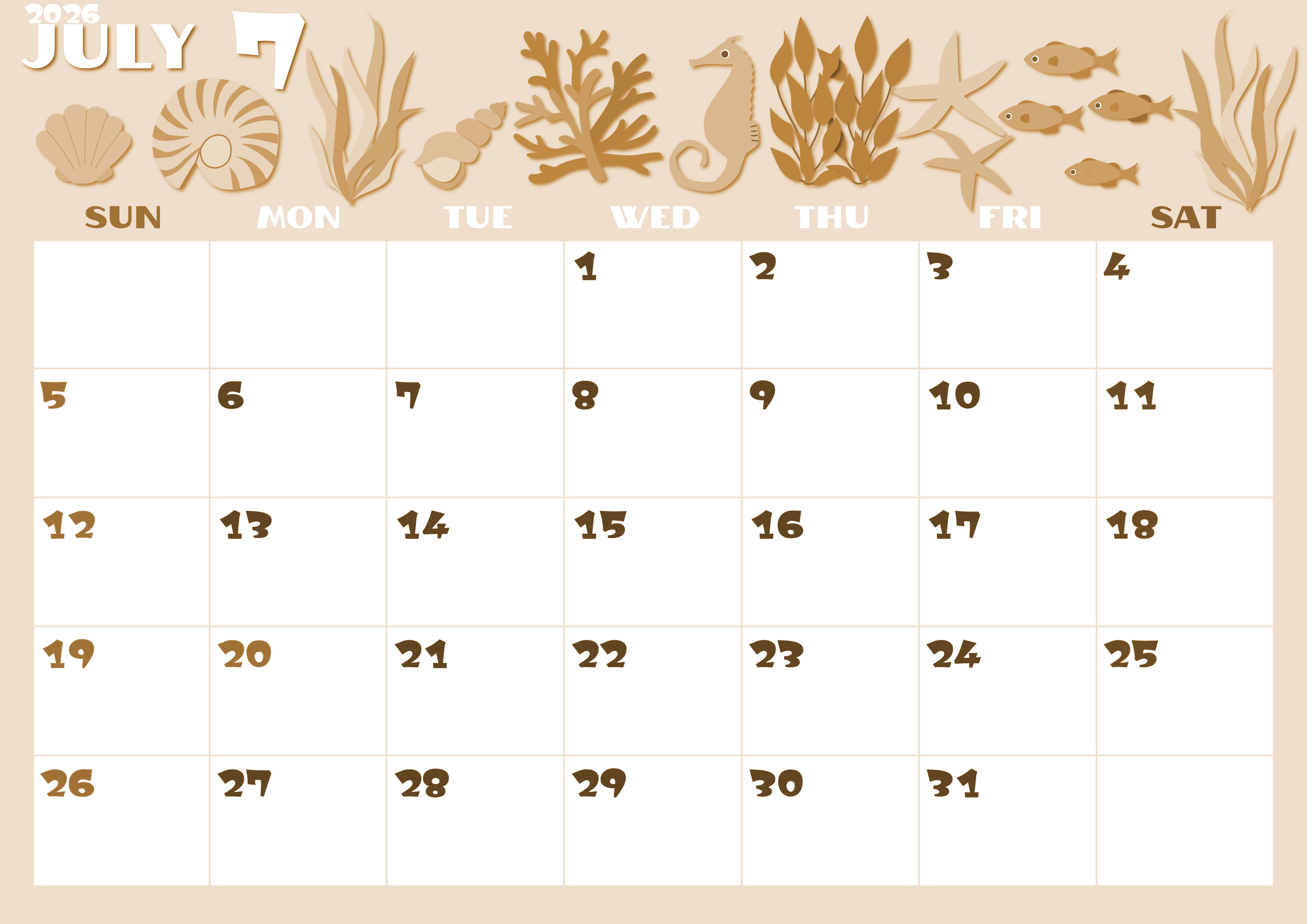 2026年・無料のカレンダーテンプレート 2026年7月横型レトロな日曜始まり 海の生き物イラストがかわいいA4無料セピア調カレンダー(2026-00660700) 素材状デザイン王 2025年4月2日 2026年7月横型レトロな日曜始まりの無料テンプレートセピア調カレンダーです。海の生き物が沢山描かれているかわいいイラストセピア調カレンダーは見やすいフォーマットでありダウンロードが無料です。(2026-00660700) 7月 横型のカレンダー 日曜始まり セピア カレンダーデザイン-0066