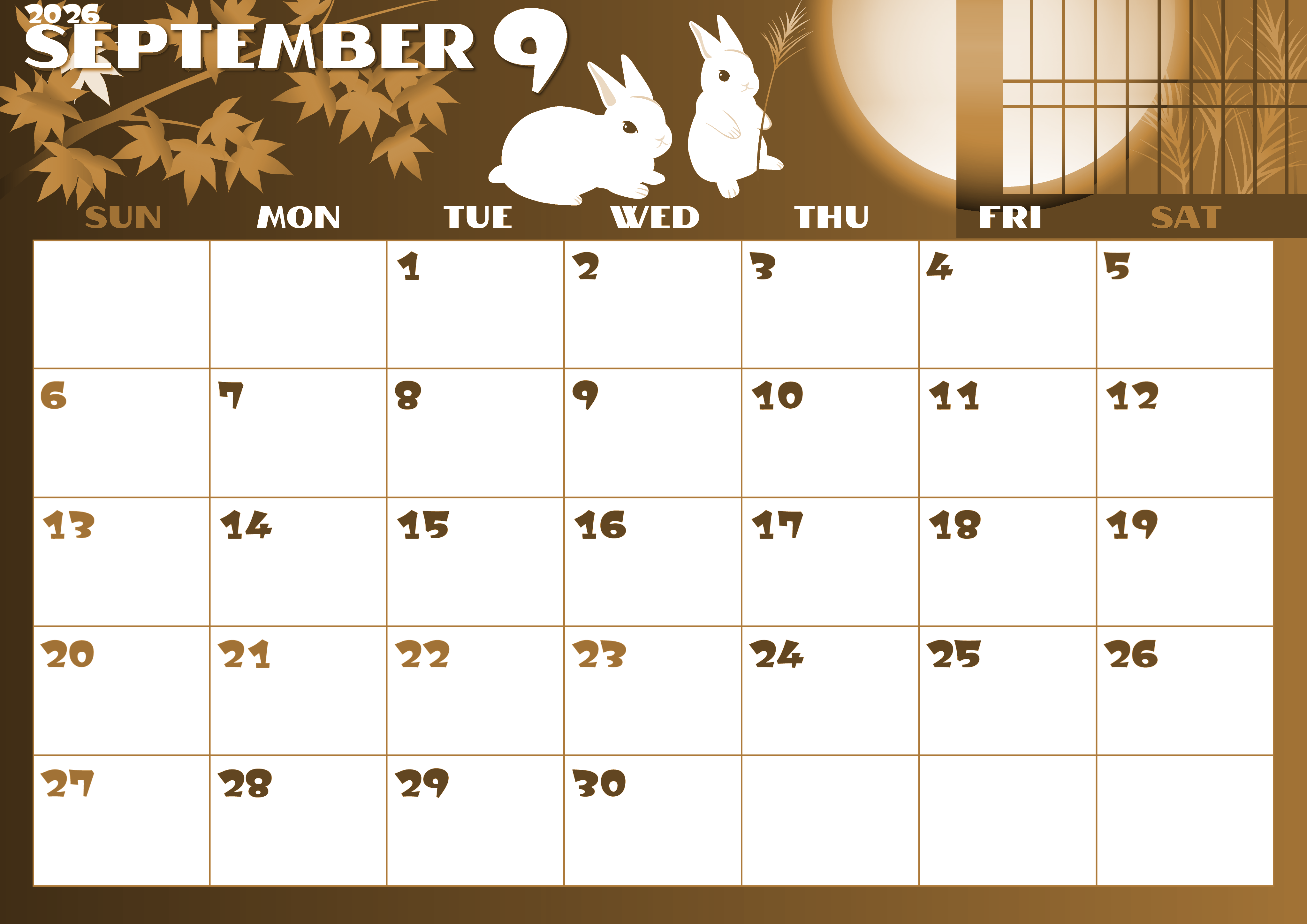 2026年・無料のカレンダーテンプレート 2026年9月横型レトロな日曜始まり うさぎイラストのかわいいA4無料セピア調カレンダー(2026-00660900) 素材状デザイン王 2025年4月2日 2026年9月横型レトロな日曜始まりの無料テンプレートセピア調カレンダーです。フレームに囲まれてセピア調カレンダーの予定記入部分が映えて実用的です。真っ白なうさぎのイラストもかわいいです。(2026-00660900) 9月 横型のカレンダー 日曜始まり セピア カレンダーデザイン-0066