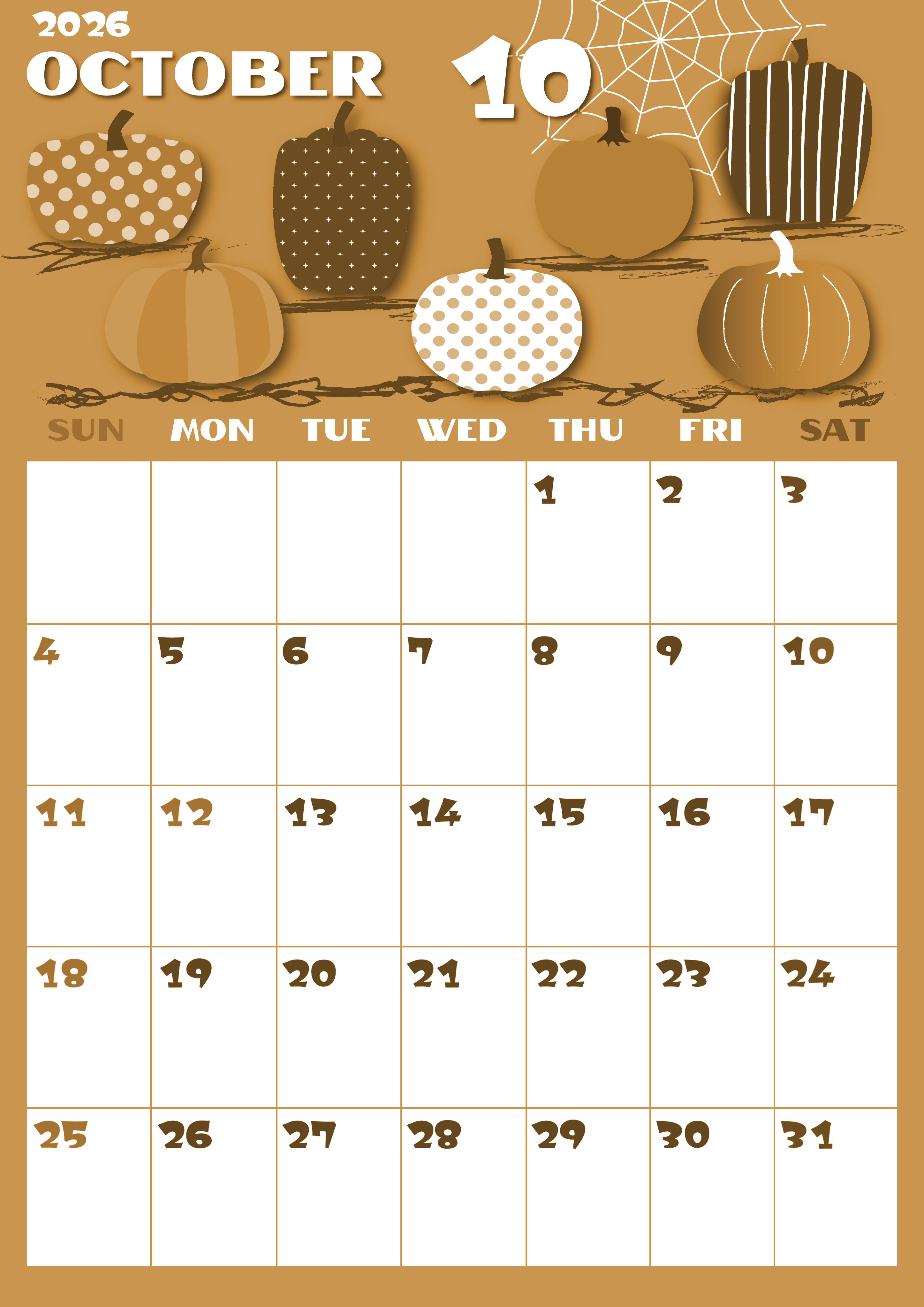2026年10月縦型レトロな日曜始まりの無料テンプレートセピア調カレンダーです。バラエティに富んだデザインのパンプキンが敷き詰められているイラスト部分がとてもかわいいです。秋の忙しい日々の整理をするのにおすすめです。(2026-00661010)