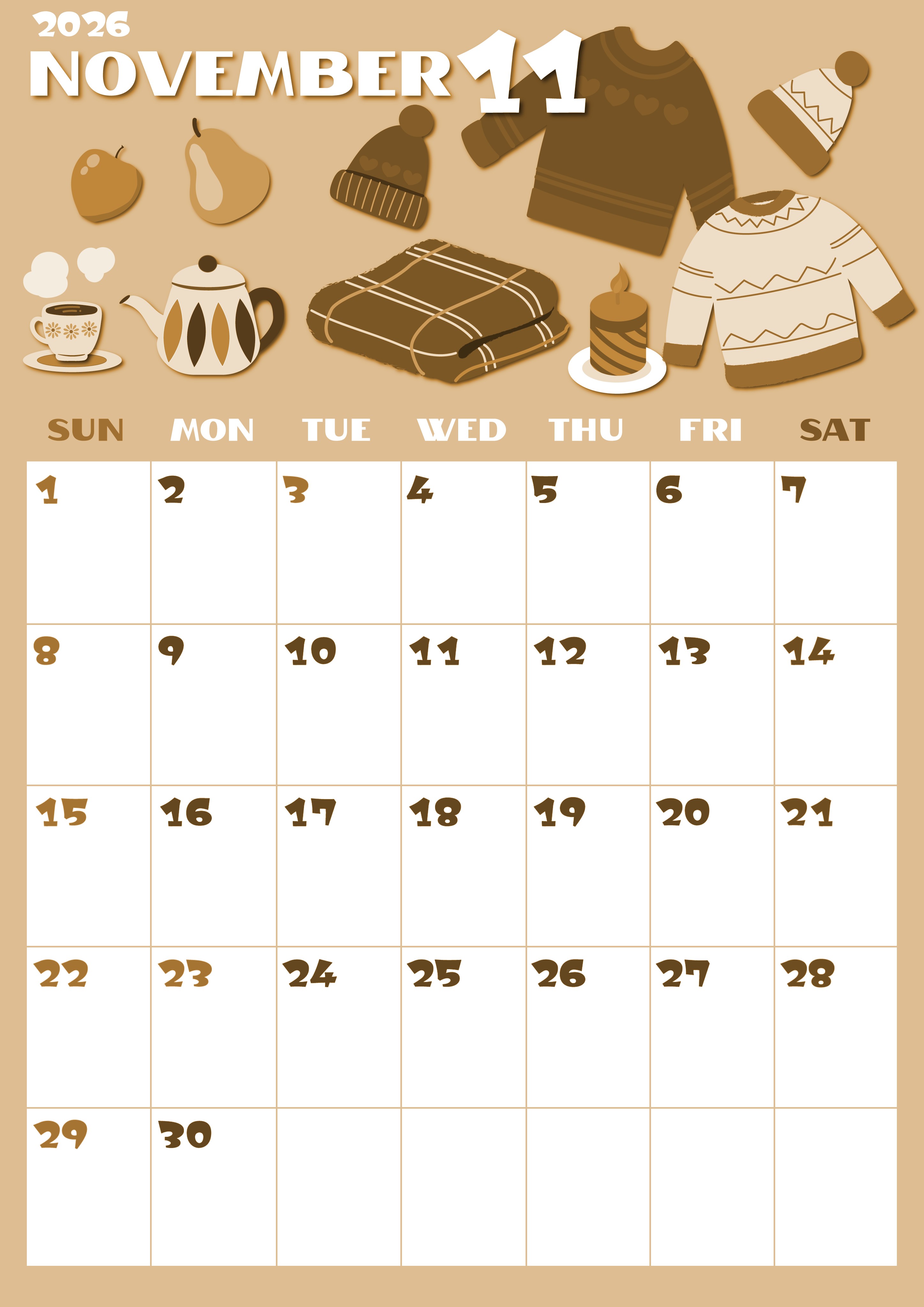 2026年11月縦型レトロな日曜始まりの無料テンプレートセピア調カレンダーです。模様の施されたセーターのイラストが秋冬の寒さを癒してくれるようなかわいいい雰囲気をまとった縦型セピア調カレンダーです。壁に貼ればいつでも見れます。(2026-00661110)