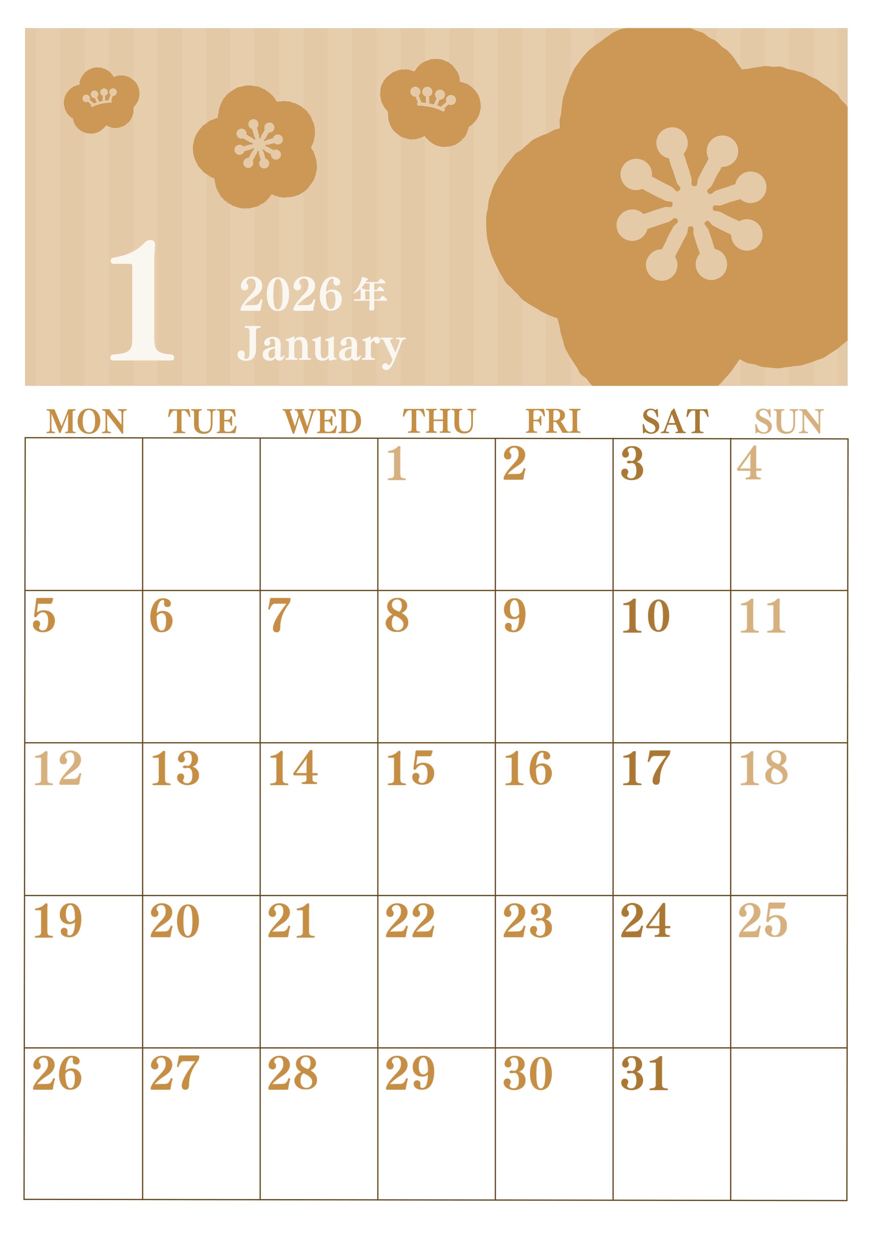 2026年・無料のカレンダーテンプレート 2026年1月縦型レトロな月曜始まり 丸い花のイラストのおしゃれA4無料セピア調カレンダー(2026-00670111) 素材状デザイン王 2025年4月2日 2026年1月縦型レトロな月曜始まりセピア調カレンダーです。丸みを帯びた花のイラストはシンプルさとおしゃれさを兼ね備えています。寒い冬でも気持ちを温めてくれるようなセピア調カレンダーです。(2026-00670111) 1月 縦型のカレンダー 月曜始まり セピア カレンダーデザイン-0067