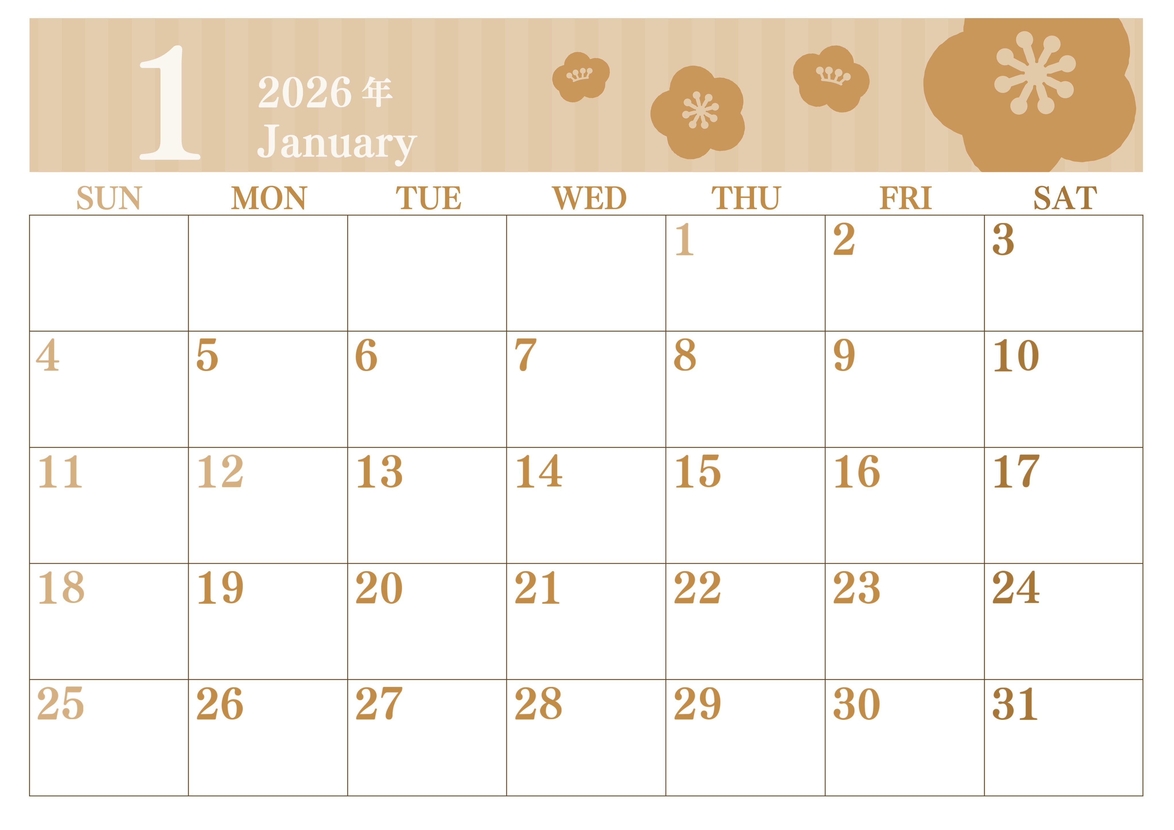 2026年1月横型レトロな日曜始まりセピア調カレンダーです。梅の花と対照的に1月の文字は白抜きで紅白の色どりで幸福を呼び寄せるようなデザインを意識したおしゃれなイラストとなっています。ダウンロードは無料で行えるセピア調カレンダーです。(2026-00670100)