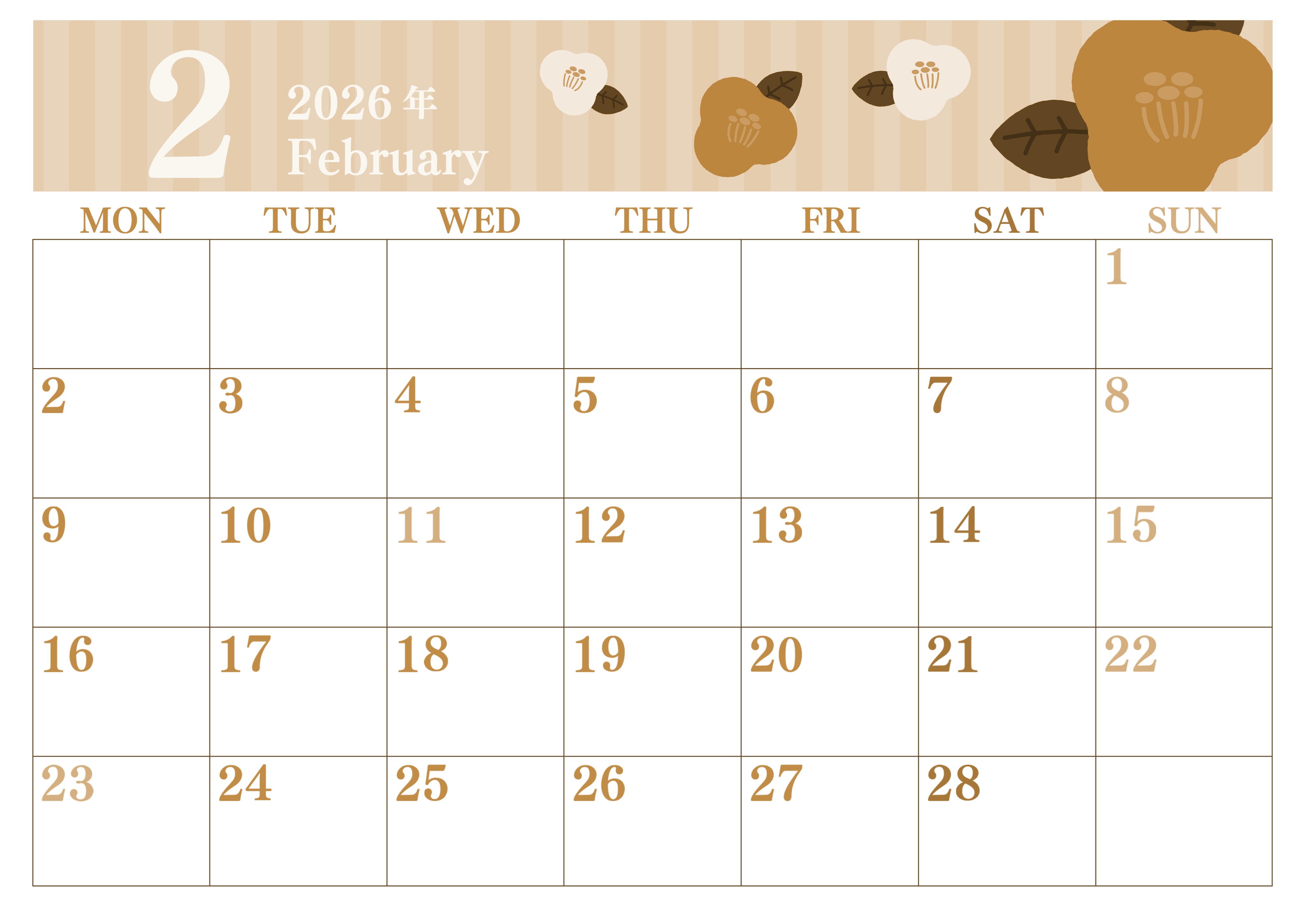 2026年2月横型レトロな月曜始まりセピア調カレンダーです。大きめの椿の花がランダムにあしらわれている背景は縦縞でおしゃれなイラスト付きの便利なテンプレートです。(2026-00670201)