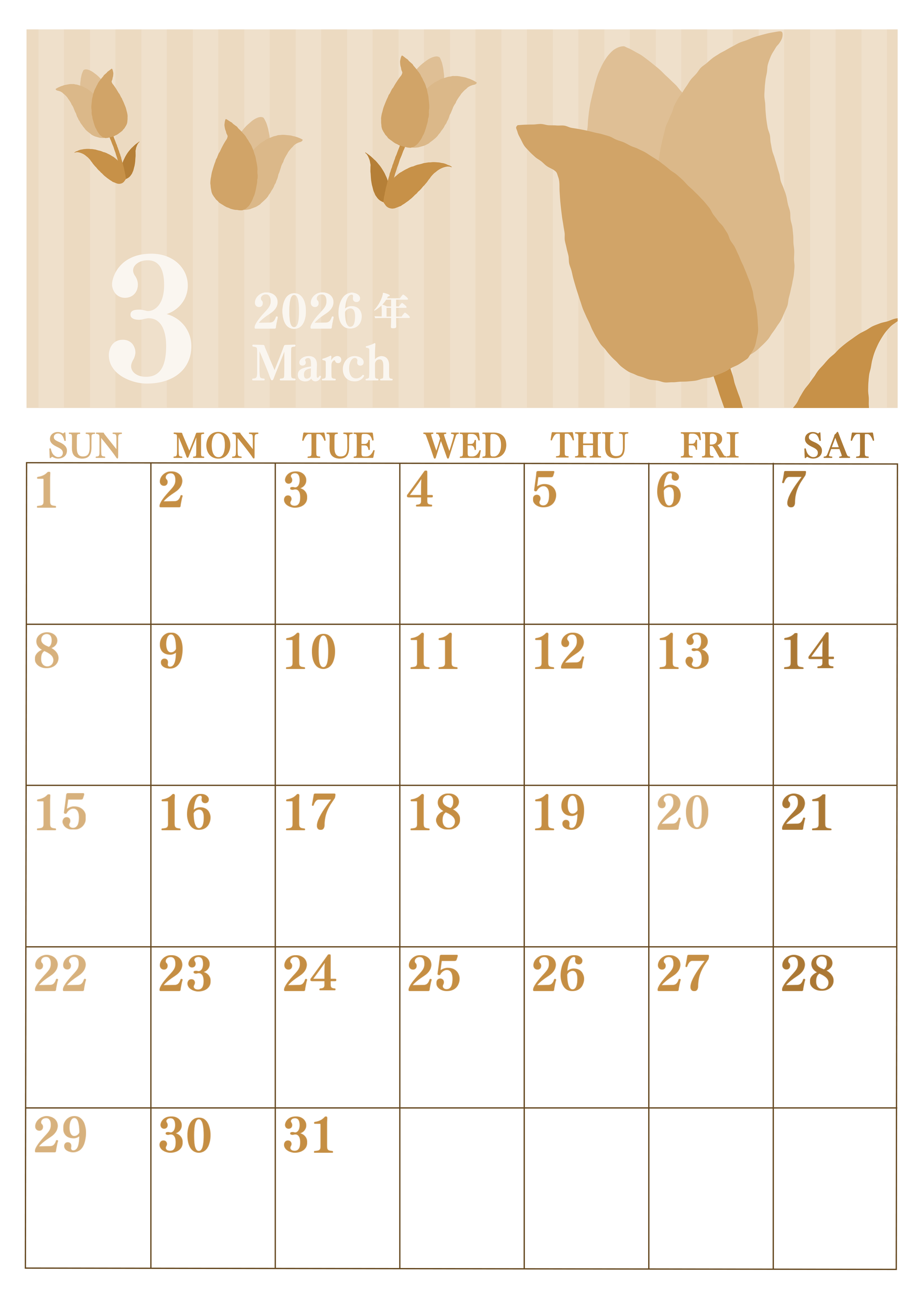 2026年3月縦型レトロな日曜始まりの無料テンプレートセピア調カレンダーです。タイトル部分の背景がしましまでかわいい季節の花であるチューリップが主役のイラストセピア調カレンダーです。A4用紙に印刷するだけなので便利です。(2026-00670310)