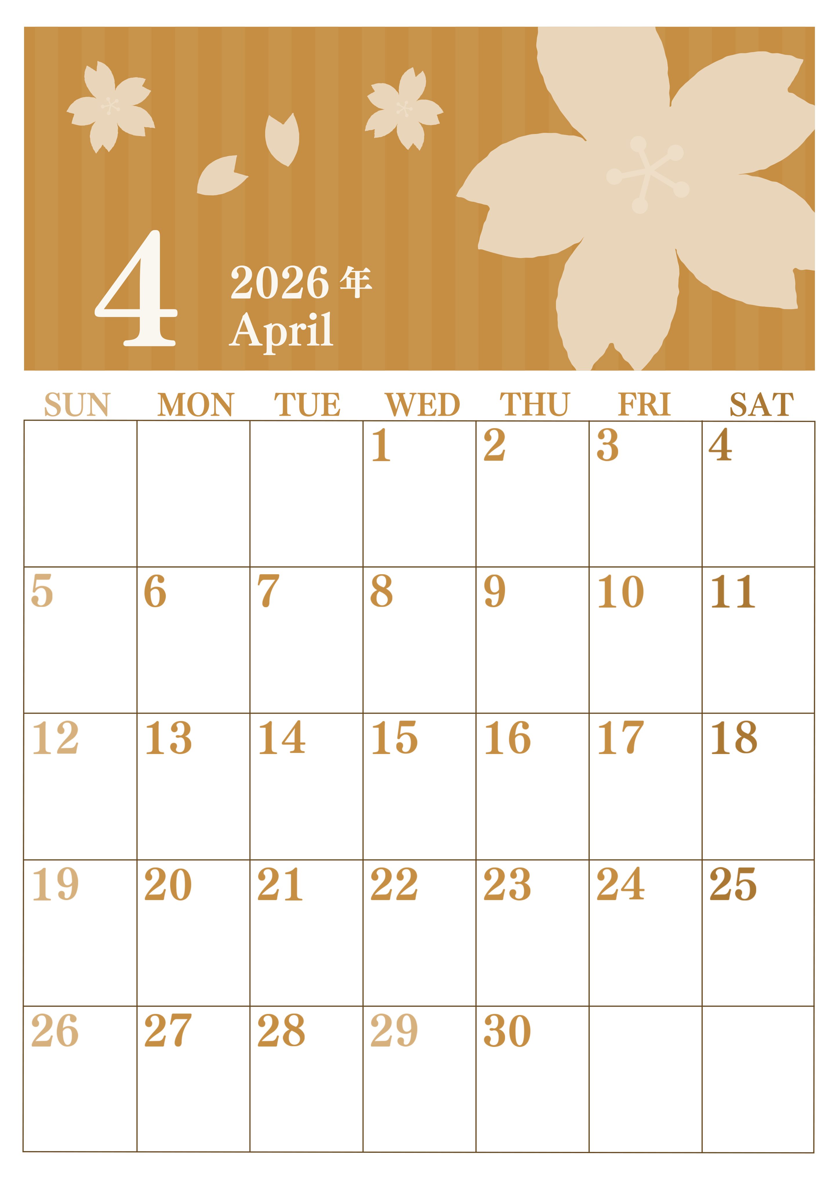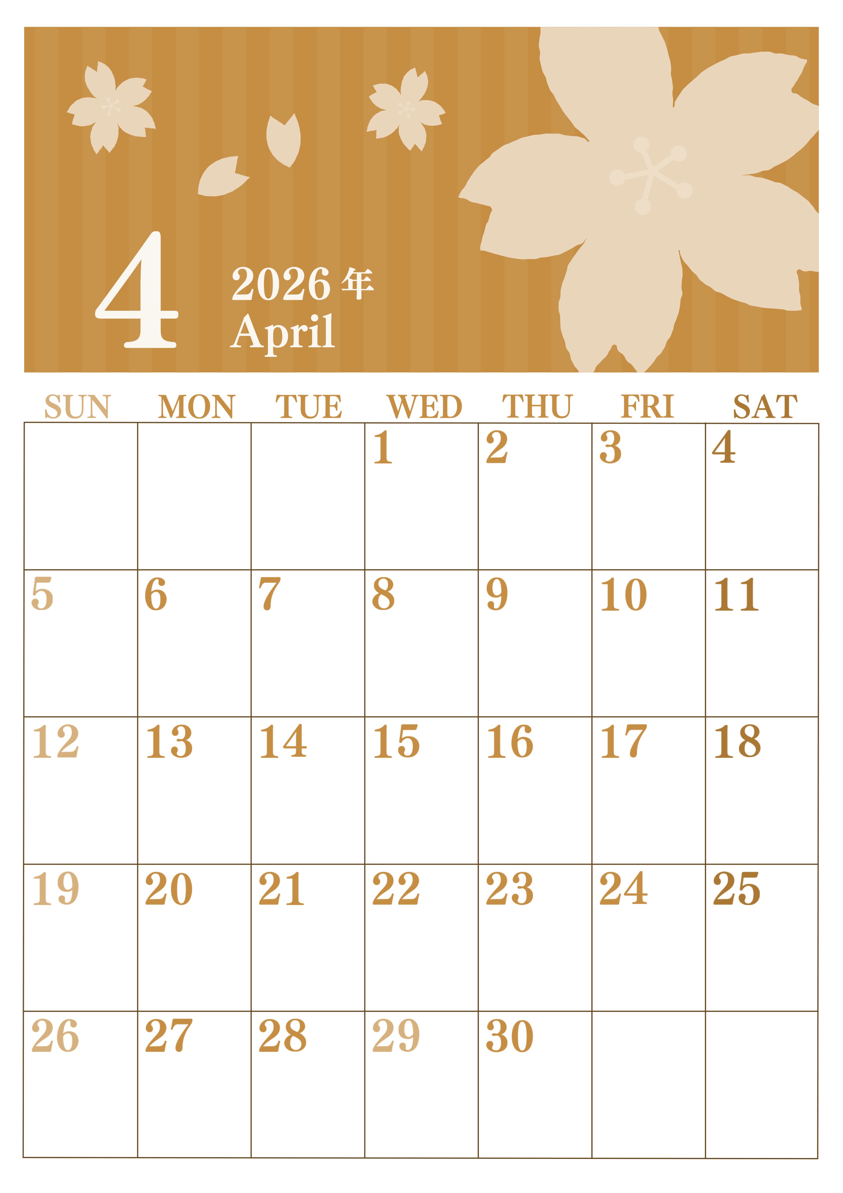 2026年・無料のカレンダーテンプレート 2026年4月縦型レトロな日曜始まり 春らしいイラストのおしゃれA4無料セピア調カレンダー(2026-00670410) 素材状デザイン王 2025年4月2日 2026年4月縦型レトロな日曜始まりの無料テンプレートセピア調カレンダーです。背景の落ち着いたストライプに大きな桜のイラストが春らしさを醸し出しているセピア調カレンダー素材となっています。(2026-00670410) 4月 縦型のカレンダー 日曜始まり セピア カレンダーデザイン-0067
