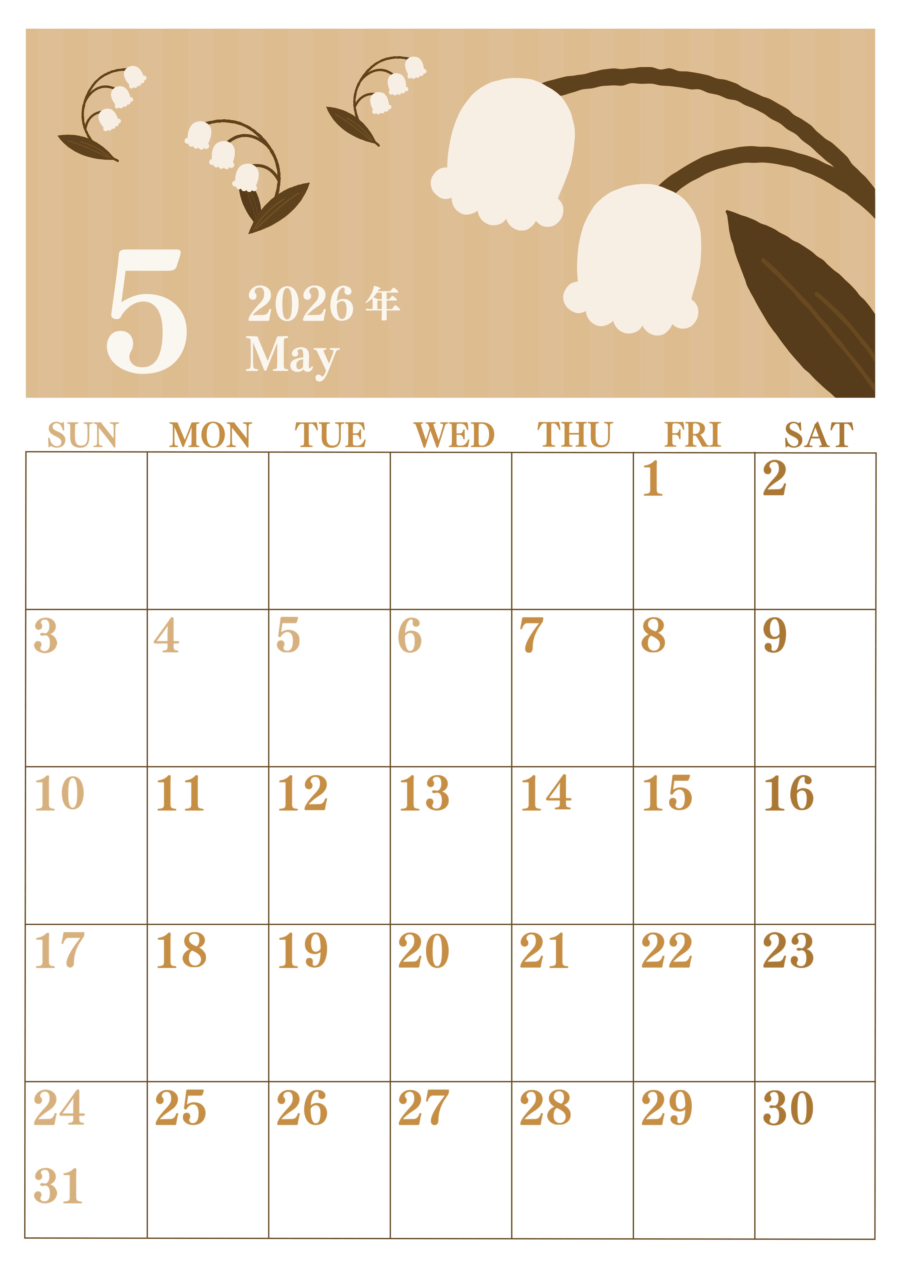 2026年5月縦型レトロな日曜始まりの無料テンプレートセピア調カレンダーです。季節の花をメインテーマに持ってきているおしゃれなセピア調カレンダーです。イラストのエリアが広すぎないので予定が沢山で多忙な人にとってとても使いやすいフォーマットです。(2026-00670510)