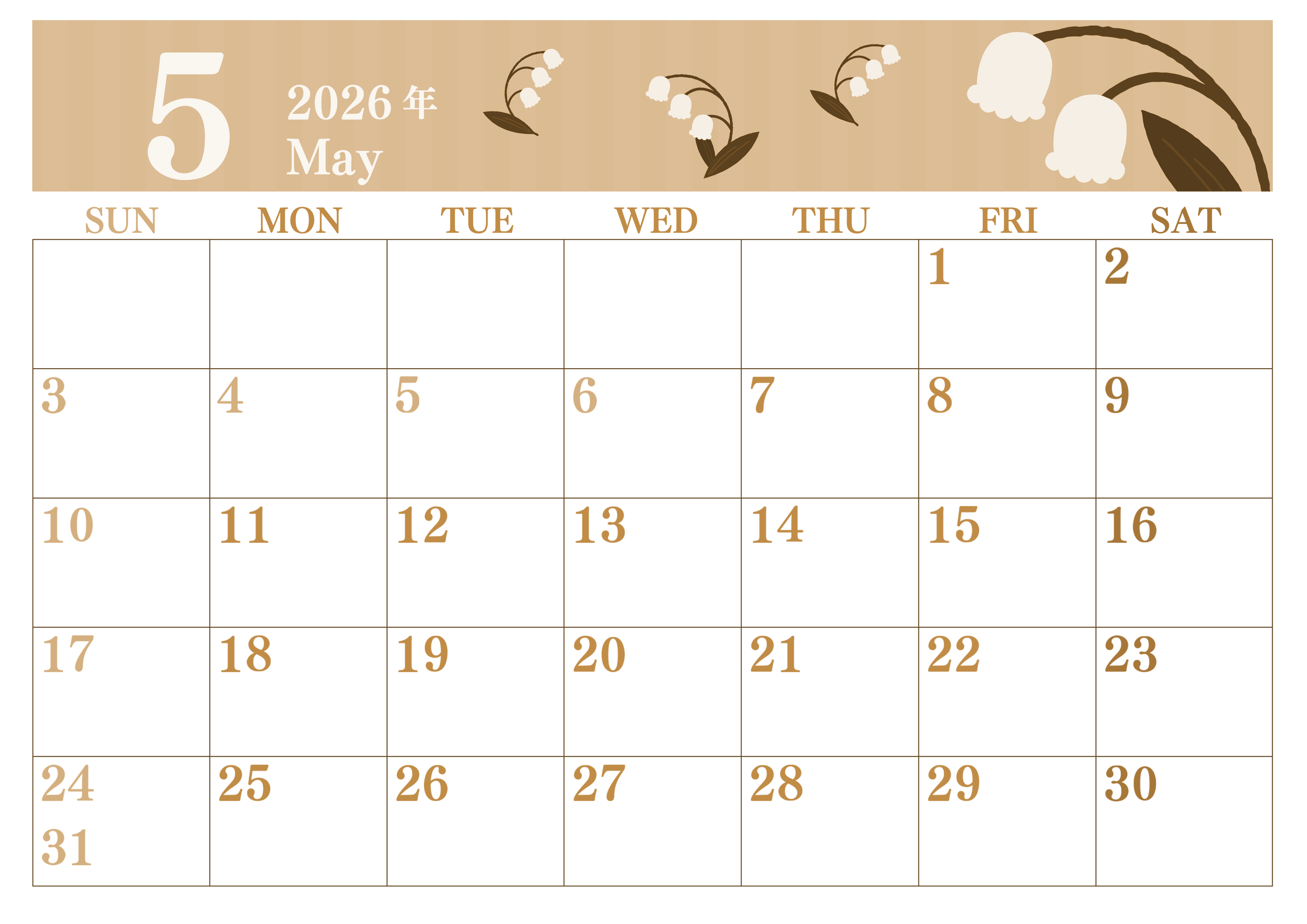 2026年5月横型レトロな日曜始まりの無料テンプレートセピア調カレンダーです。おちついた季節の花であるすずらんのイラストが素朴でおしゃれで大人っぽいセピア調カレンダーです。白紙に印刷するだけで簡単便利です。(2026-00670500)