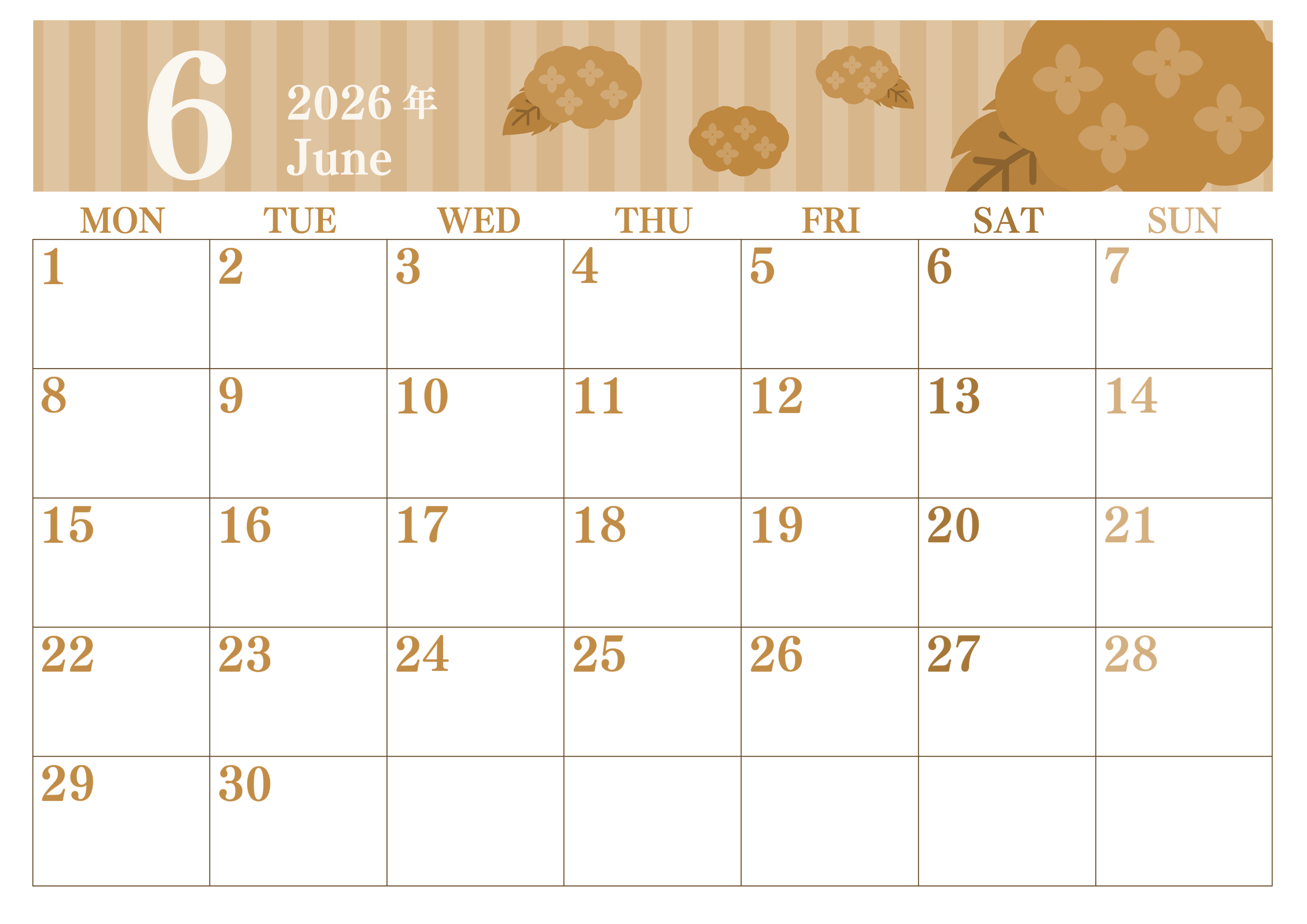2026年6月横型レトロな月曜始まりの無料テンプレートセピア調カレンダーです。月曜始まりセピア調カレンダーを使い慣れているという人に無料ダウンロードをおすすめしたいアジサイのイラストがおしゃれで梅雨が嬉しくなるようなフリー素材です。(2026-00670601)
