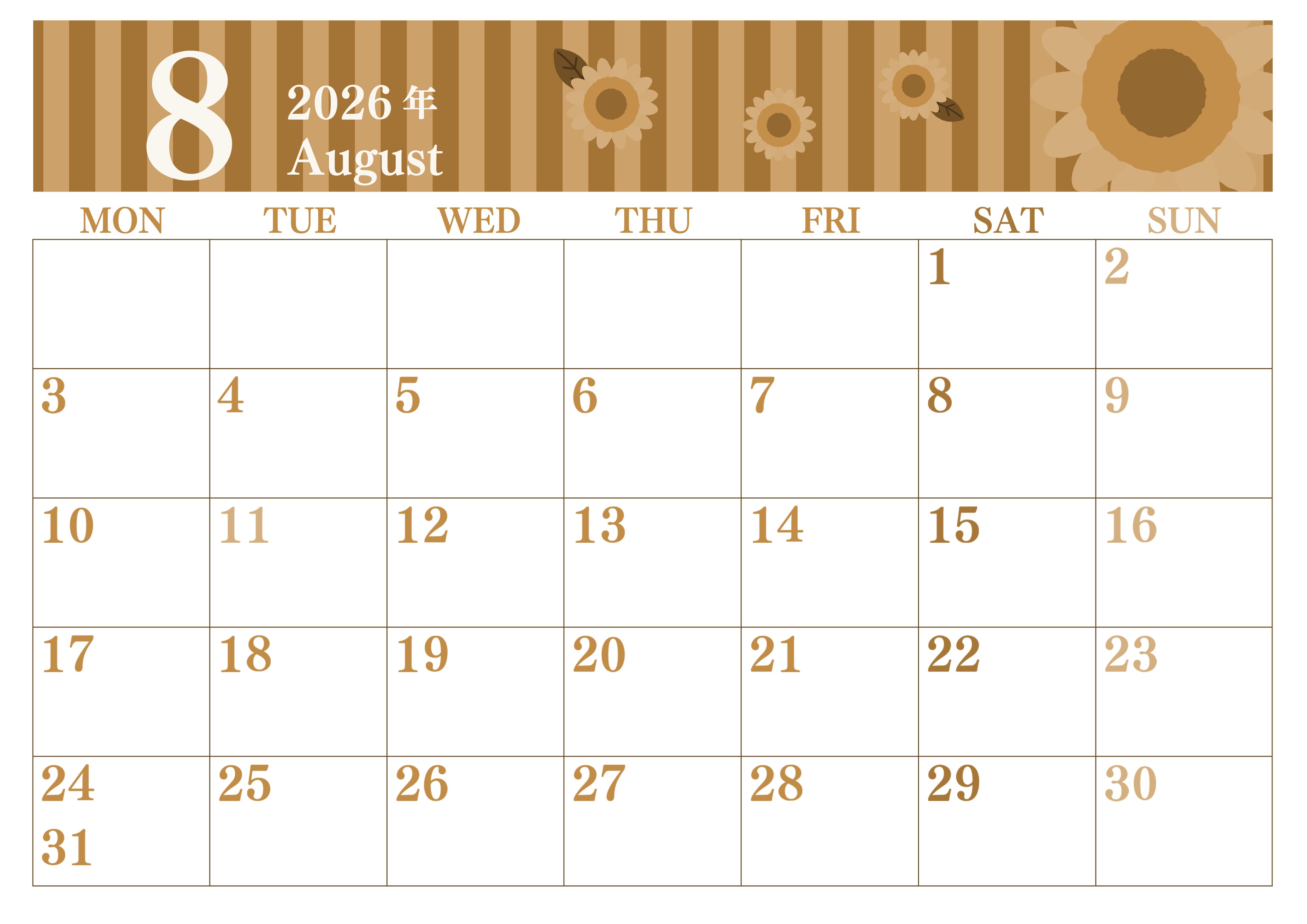 2026年8月横型レトロな月曜始まりの無料テンプレートセピア調カレンダーです。真夏をテーマにしたイラストがかわいいだけでなく月曜始まりで曜日の文字が色分けされた実用性がとても高い無料で使えるセピア調カレンダーです。(2026-00670801)