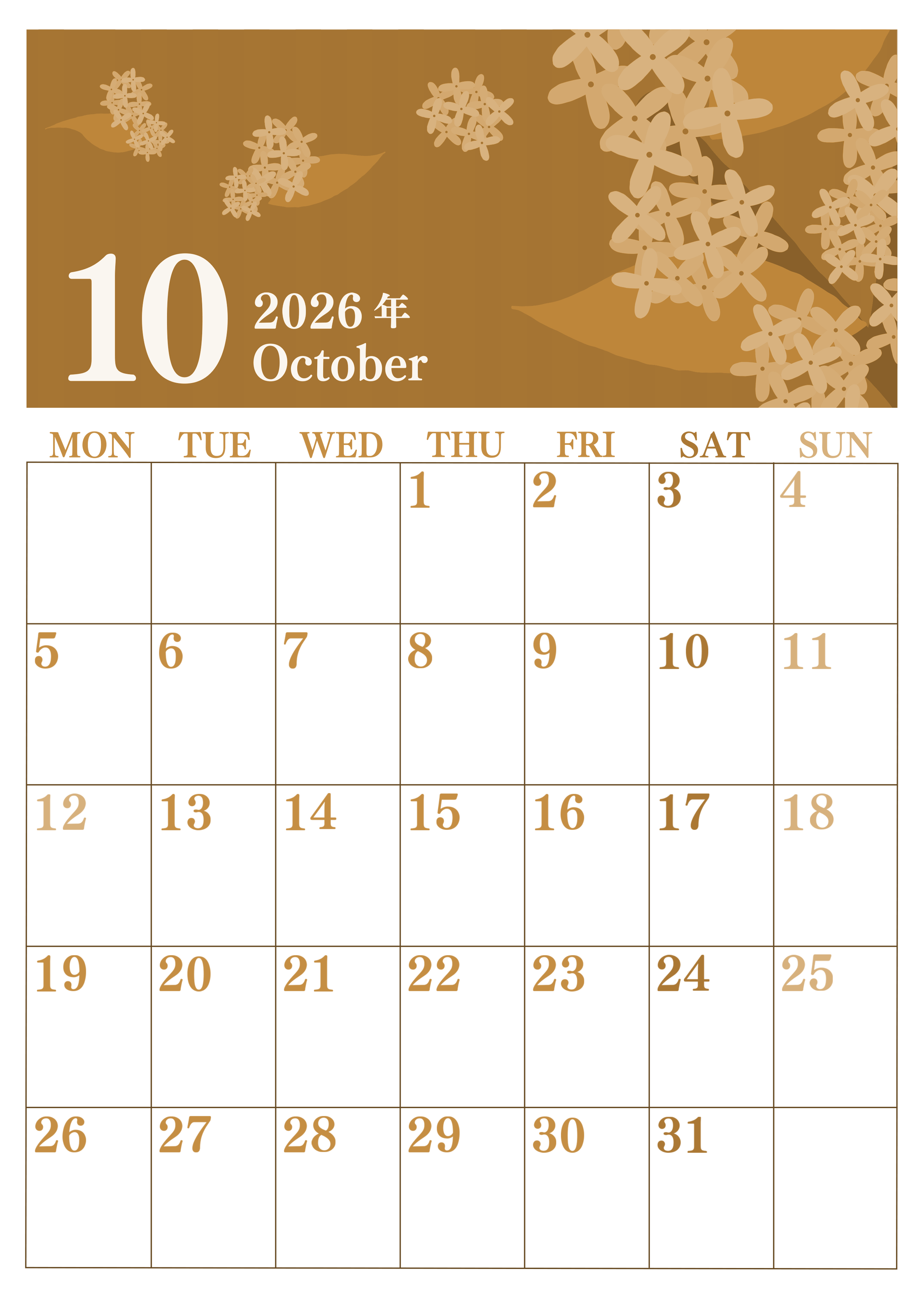 2026年・無料のカレンダーテンプレート 2026年10月縦型レトロな月曜始まり 金木犀イラストのおしゃれA4無料セピア調カレンダー(2026-00671011) 素材状デザイン王 2025年4月2日 2026年10月縦型レトロな月曜始まりの無料テンプレートセピア調カレンダーです。背景に金木製がちりばめられているデザインがとてもおしゃれなイラストです。月曜始まりなので予定の記入がしやすいです。(2026-00671011) 10月 縦型のカレンダー 月曜始まり セピア カレンダーデザイン-0067