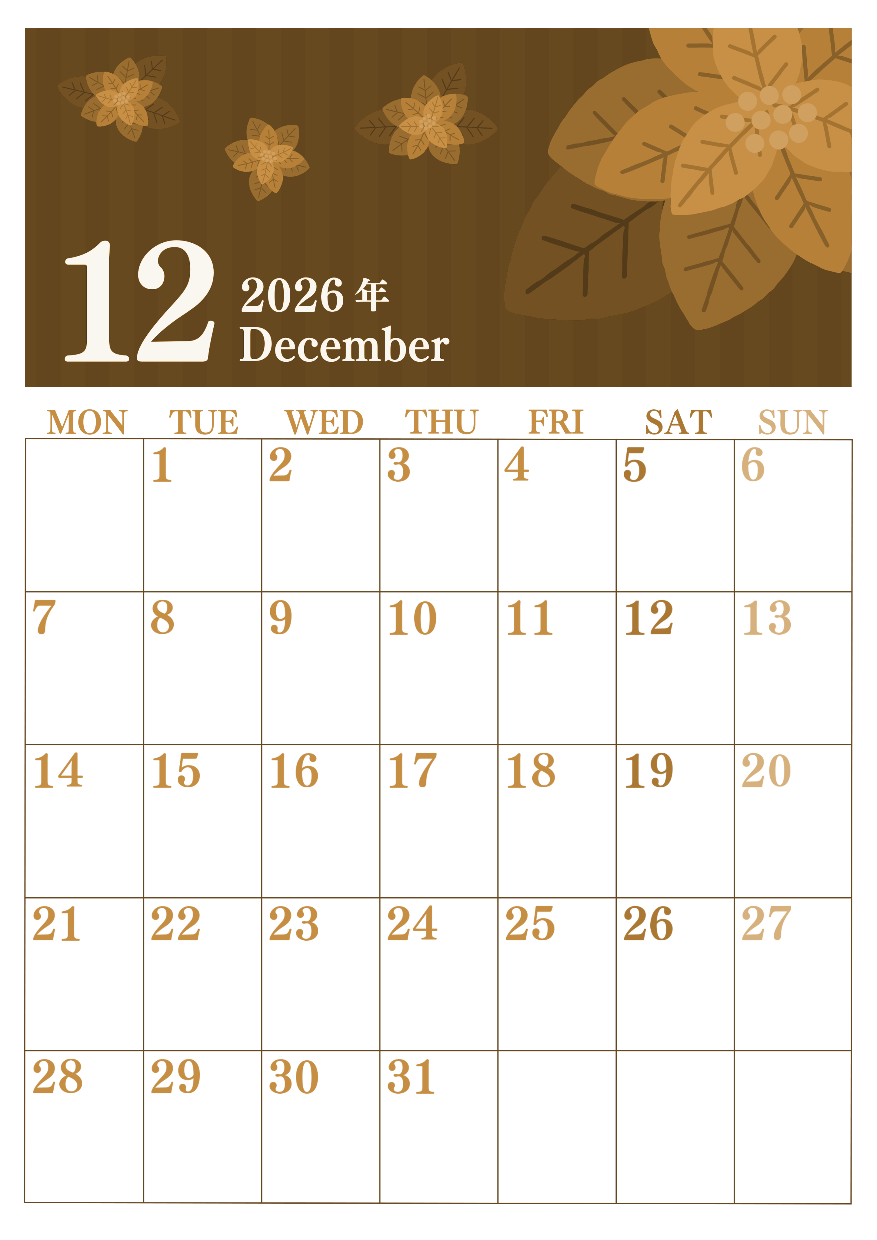 2026年12月縦型レトロな月曜始まりの無料テンプレートセピア調カレンダーです。ポインセチアがとても大人っぽくておしゃれで落ち着いた雰囲気のイラストに仕上がっています。月曜始まりで予定管理しやすいです。(2026-00671211)