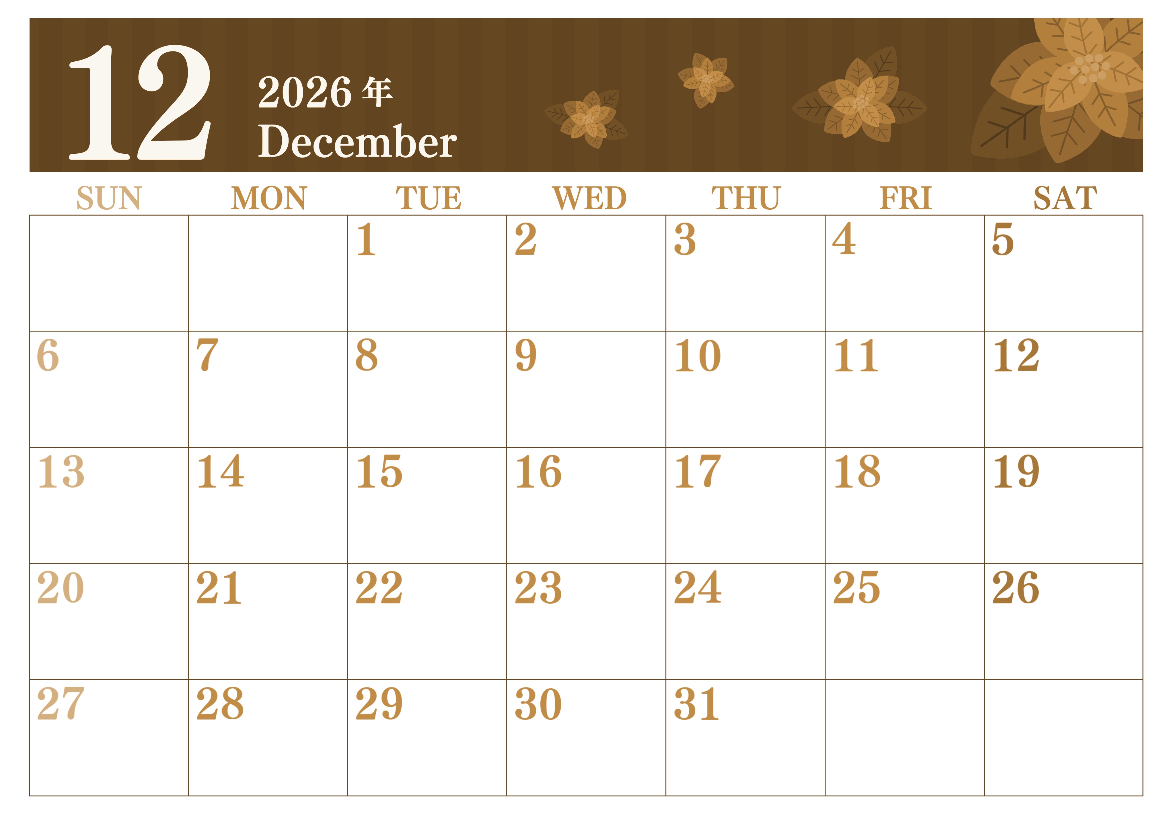 2026年12月横型レトロな日曜始まりの無料テンプレートセピア調カレンダーです。ポインセチアが主役のおしゃれで豪華なイラストです。曜日によって文字の色分けがされているので見やすいです。ダウンロードは無料です。(2026-00671200)
