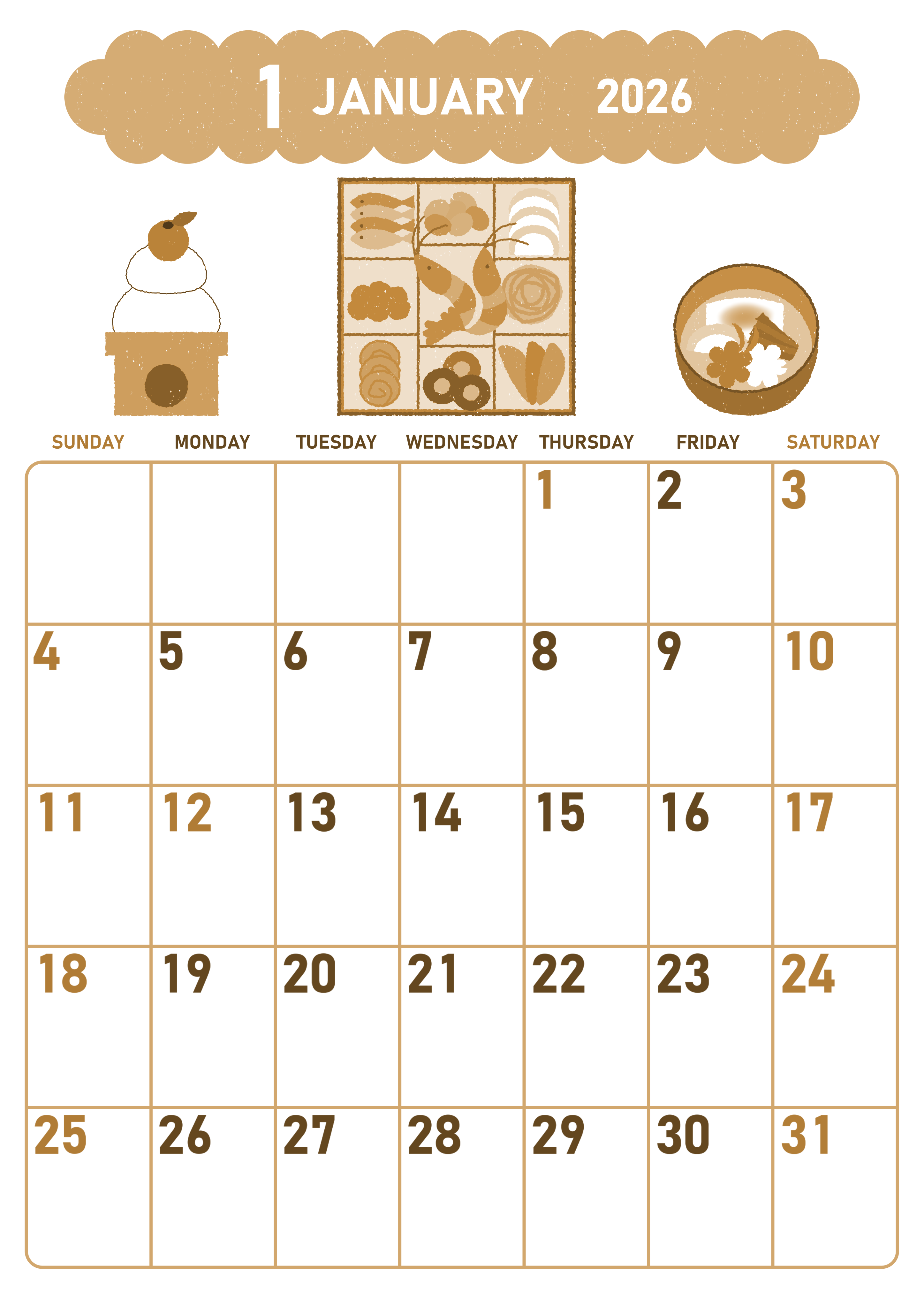 2026年1月縦型レトロな日曜始まりセピア調カレンダーです。1月January2026年を乗せた雲が左上に配置されていてセピア調カレンダーとして見やすいフォーマットとなっています。お節や鏡餅やお雑煮のイラストだけでなく曜日が色分けされているのもおすすめポイントな無料セピア調カレンダーです。(2026-00680110)
