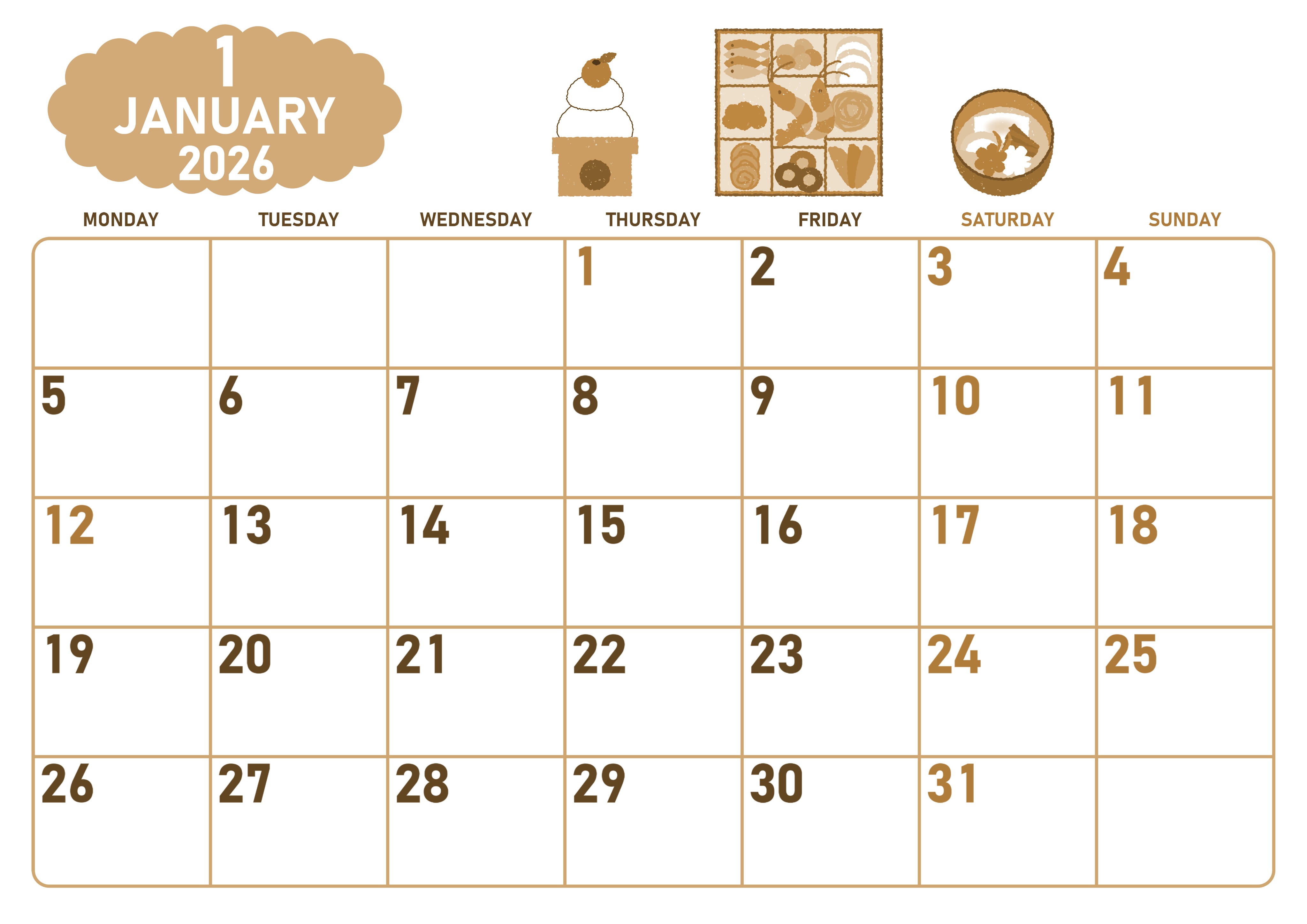 2026年1月横型レトロな月曜始まり ポップなお節イラストのかわいいA4無料セピア調カレンダー(2026-00680101)