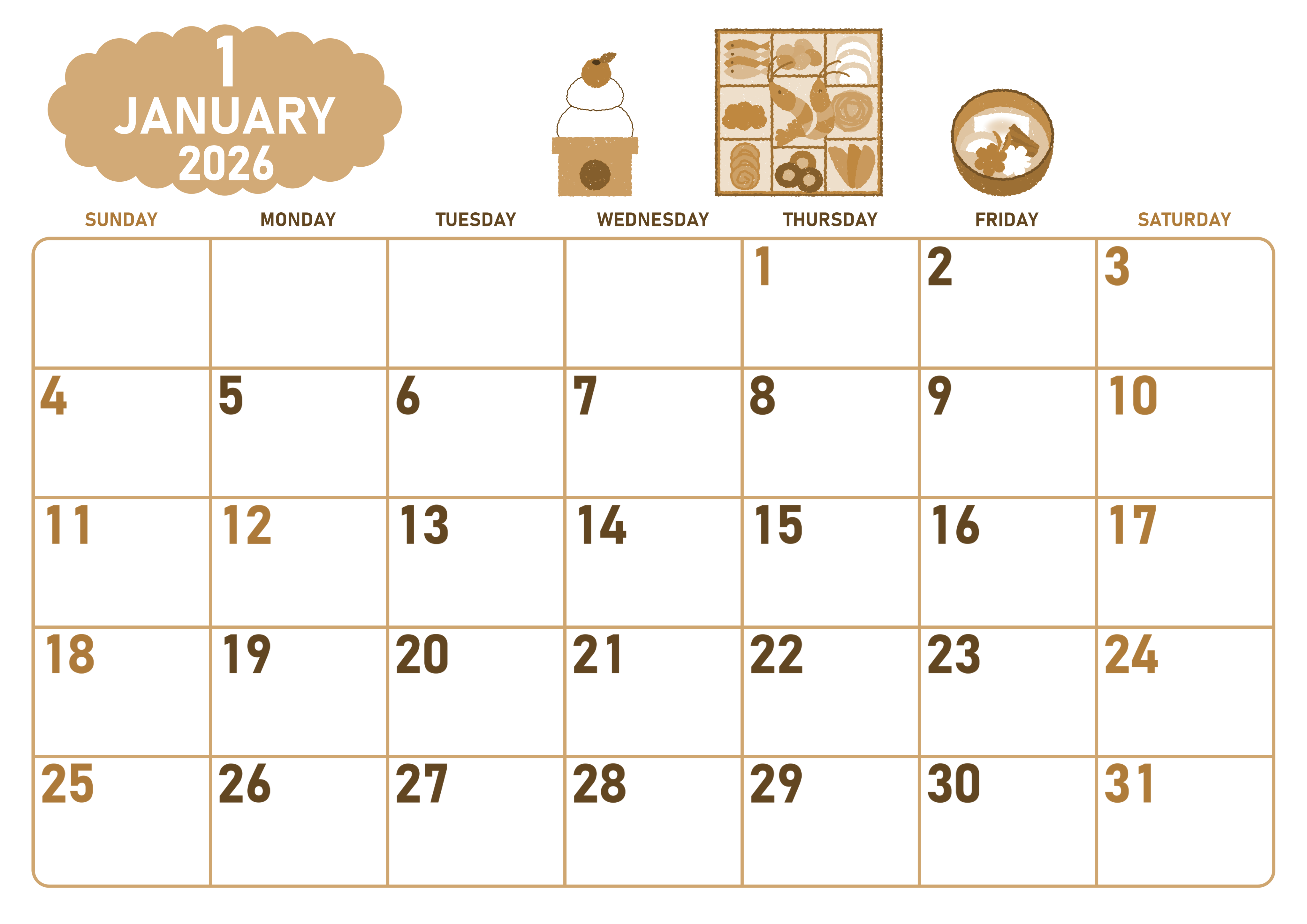 2026年1月横型レトロな日曜始まりセピア調カレンダーです。1月January2026年という文字がふわふわの雲で囲まれていてかわいいです。お節のイラストもあけましておめでとう感が満載なダウンロードが無料の素材です。(2026-00680100)