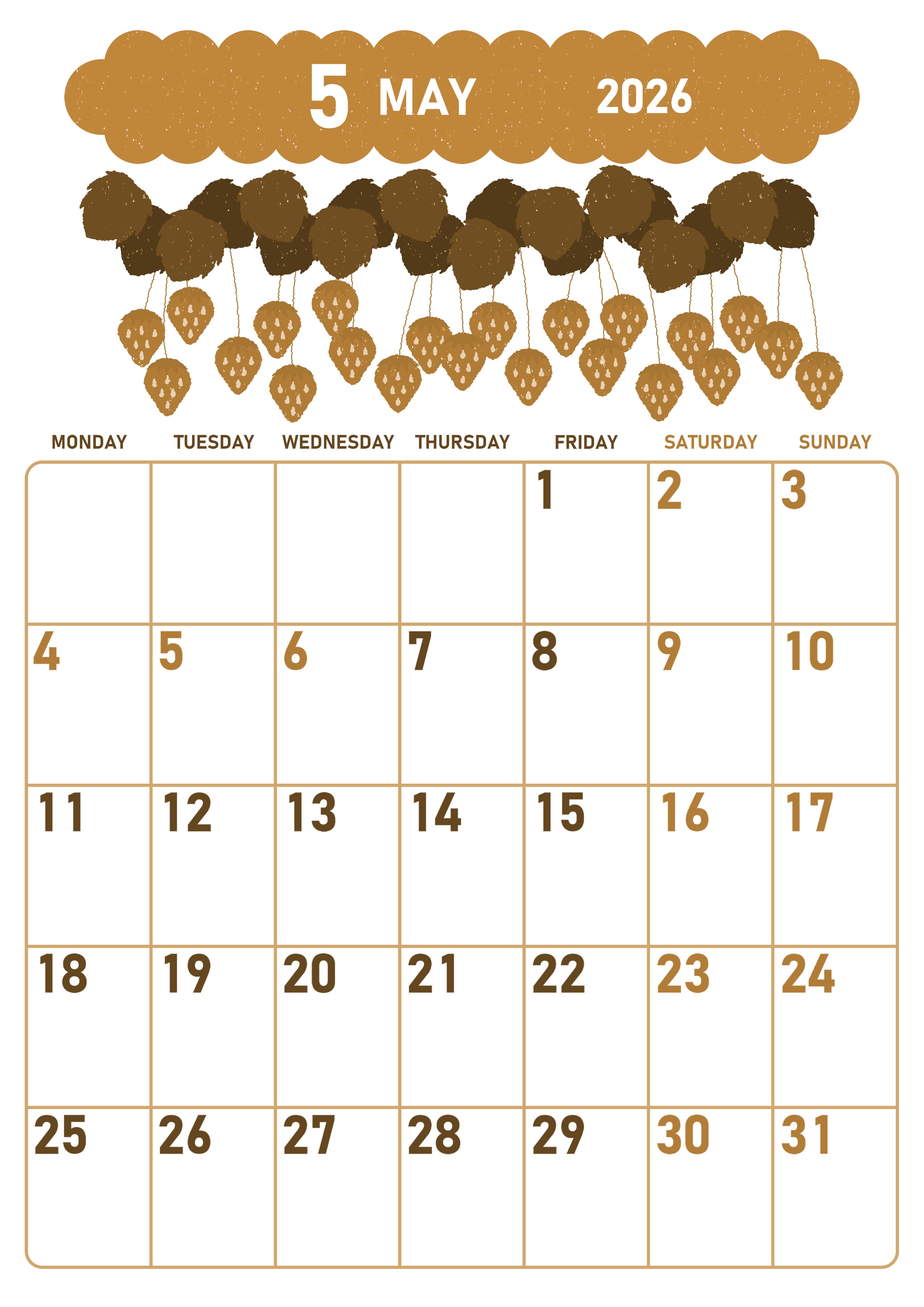 2026年5月縦型レトロな月曜始まりの無料テンプレートセピア調カレンダーです。月曜始まりセピア調カレンダーに慣れている方に無料ダウンロードしていただきたいいちごのイラストがとてもかわいいユニークなフリー素材です。(2026-00680511)