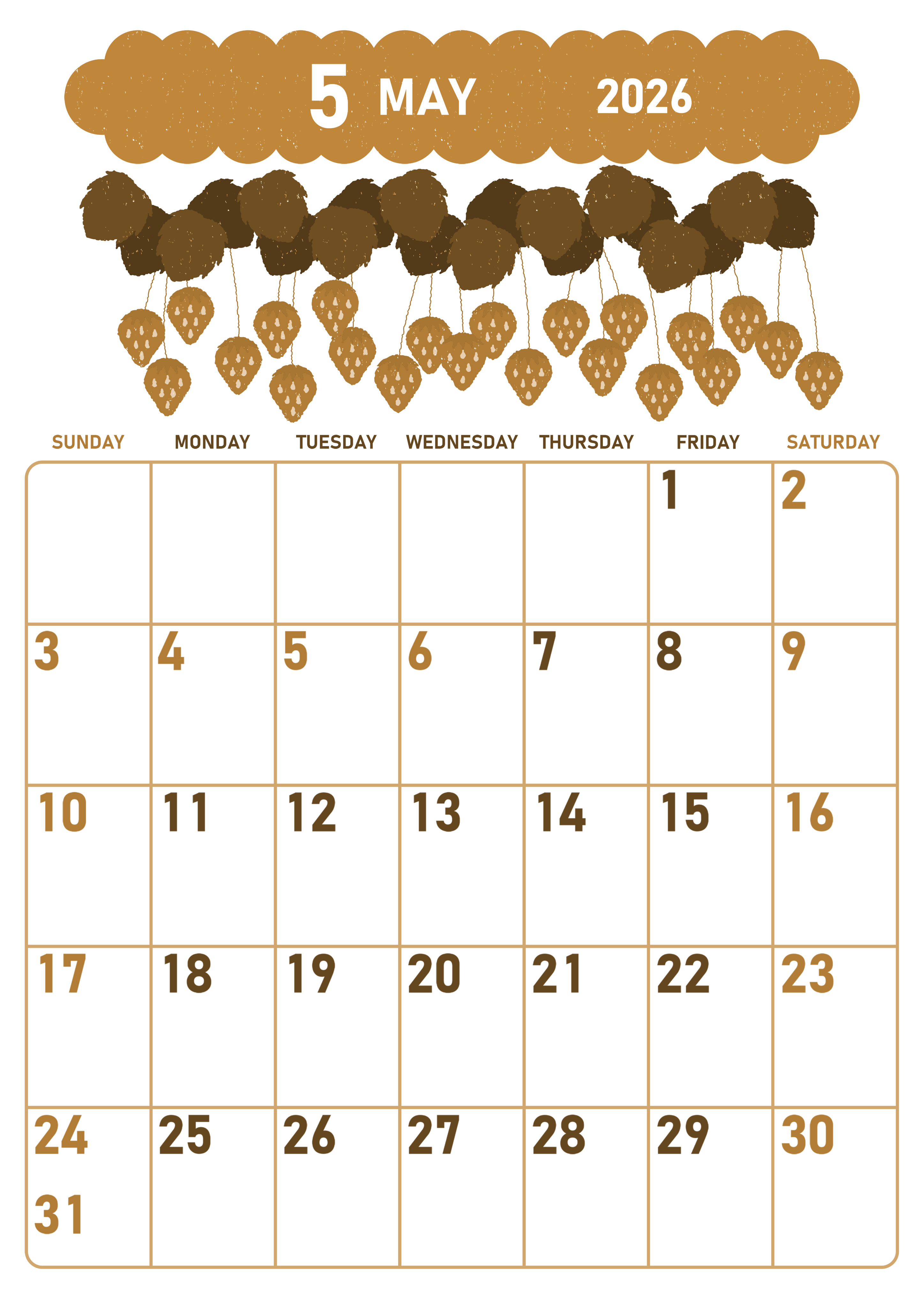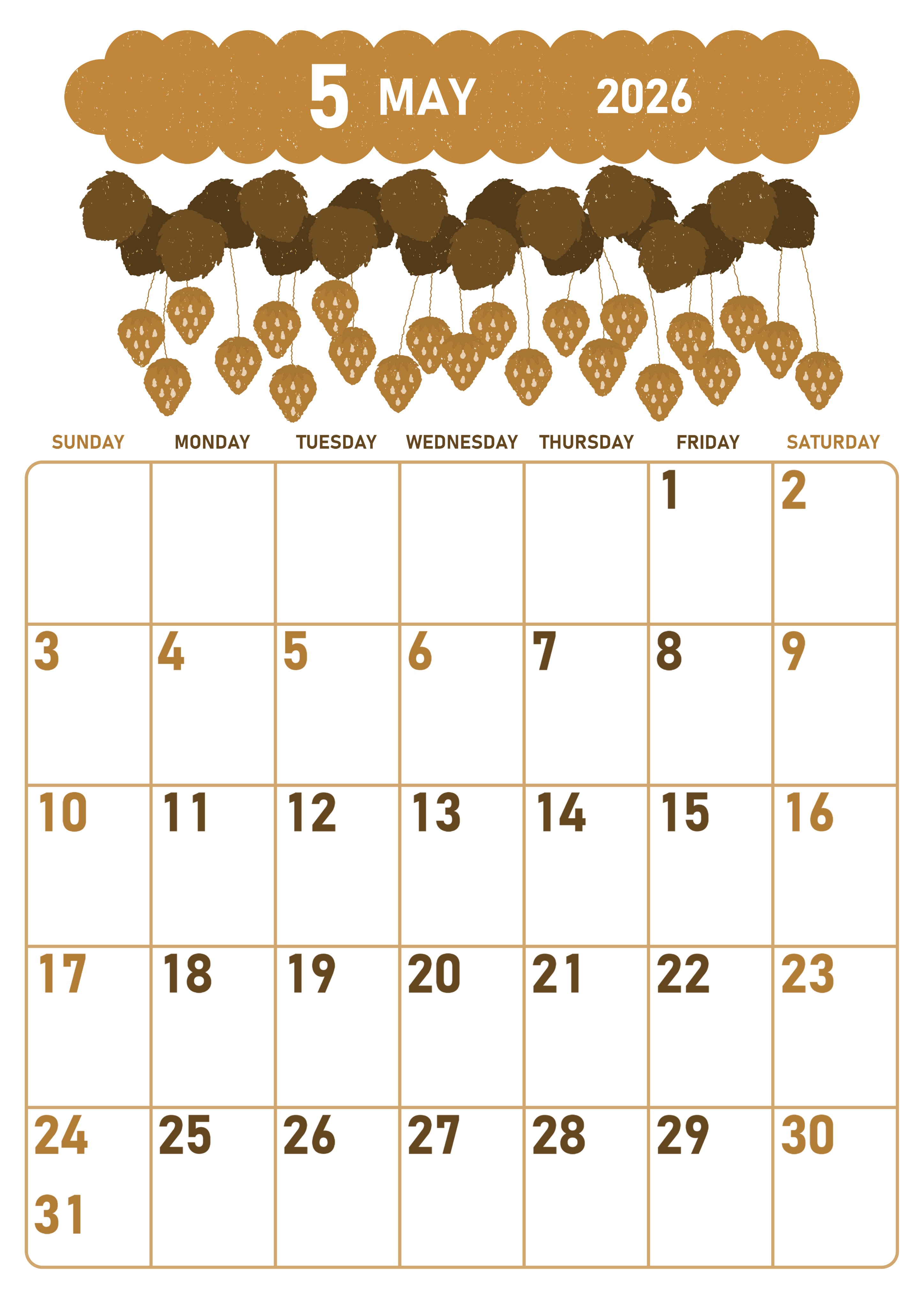 2026年5月縦型レトロな日曜始まりの無料テンプレートセピア調カレンダーです。かわいいいちごが食欲をそそるようなイラスト付きセピア調カレンダーです。A4サイズの汎用的なセピア調カレンダーなので無料でダウンロードを行えばすぐにご利用可能です。(2026-00680510)