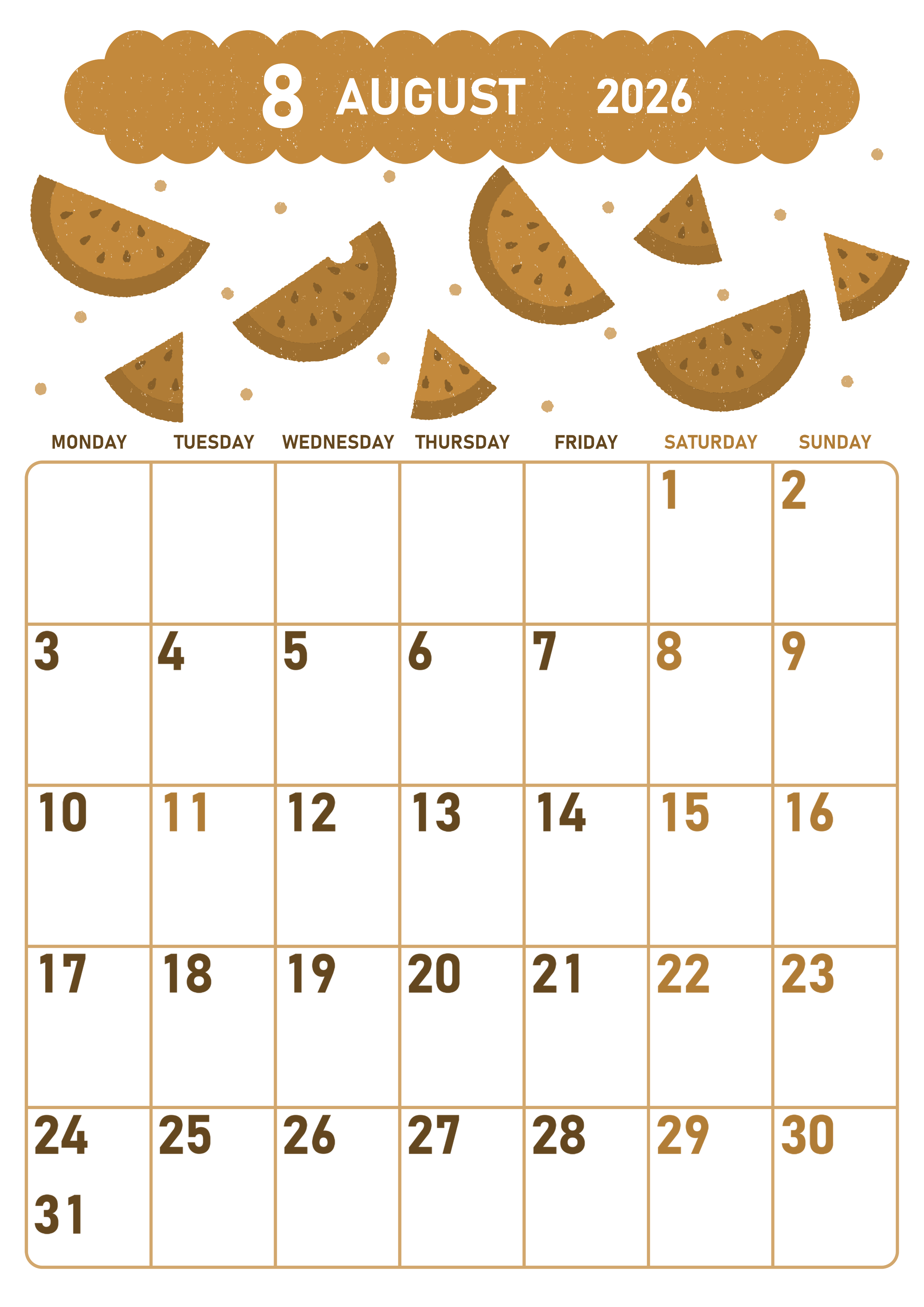 2026年8月縦型レトロな月曜始まりの無料テンプレートセピア調カレンダーです。月曜始まりでオリジナルイラストがついている使うのが楽しいセピア調カレンダーです。季節の果物であるスイカがちりばめられていて眺めていて癒されます。(2026-00680811)