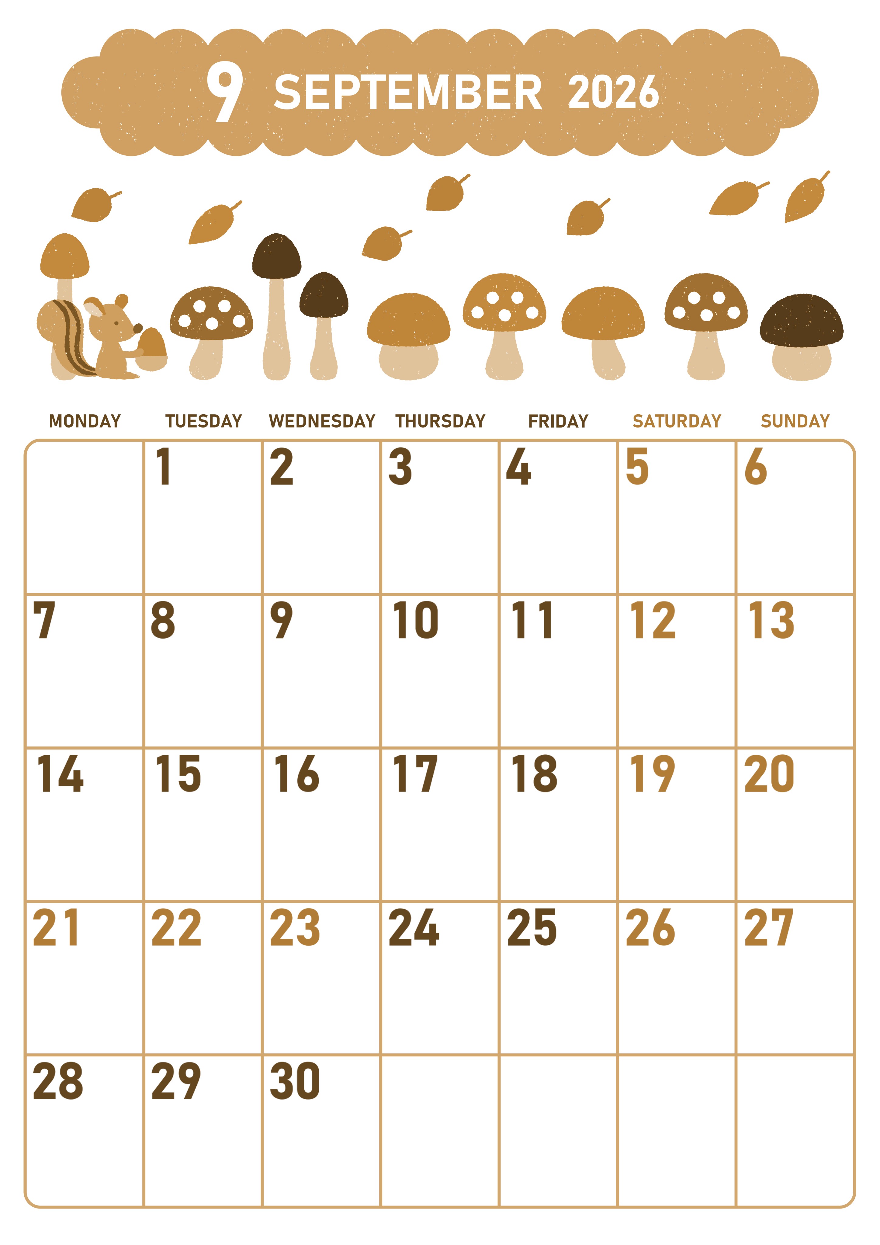 2026年9月縦型レトロな月曜始まりの無料テンプレートセピア調カレンダーです。秋の季節をテーマにしているイラストがほのぼのとしていてかわいいデザインです。月曜始まりで予定を把握しやすいレイアウトに仕上がっています。(2026-00680911)