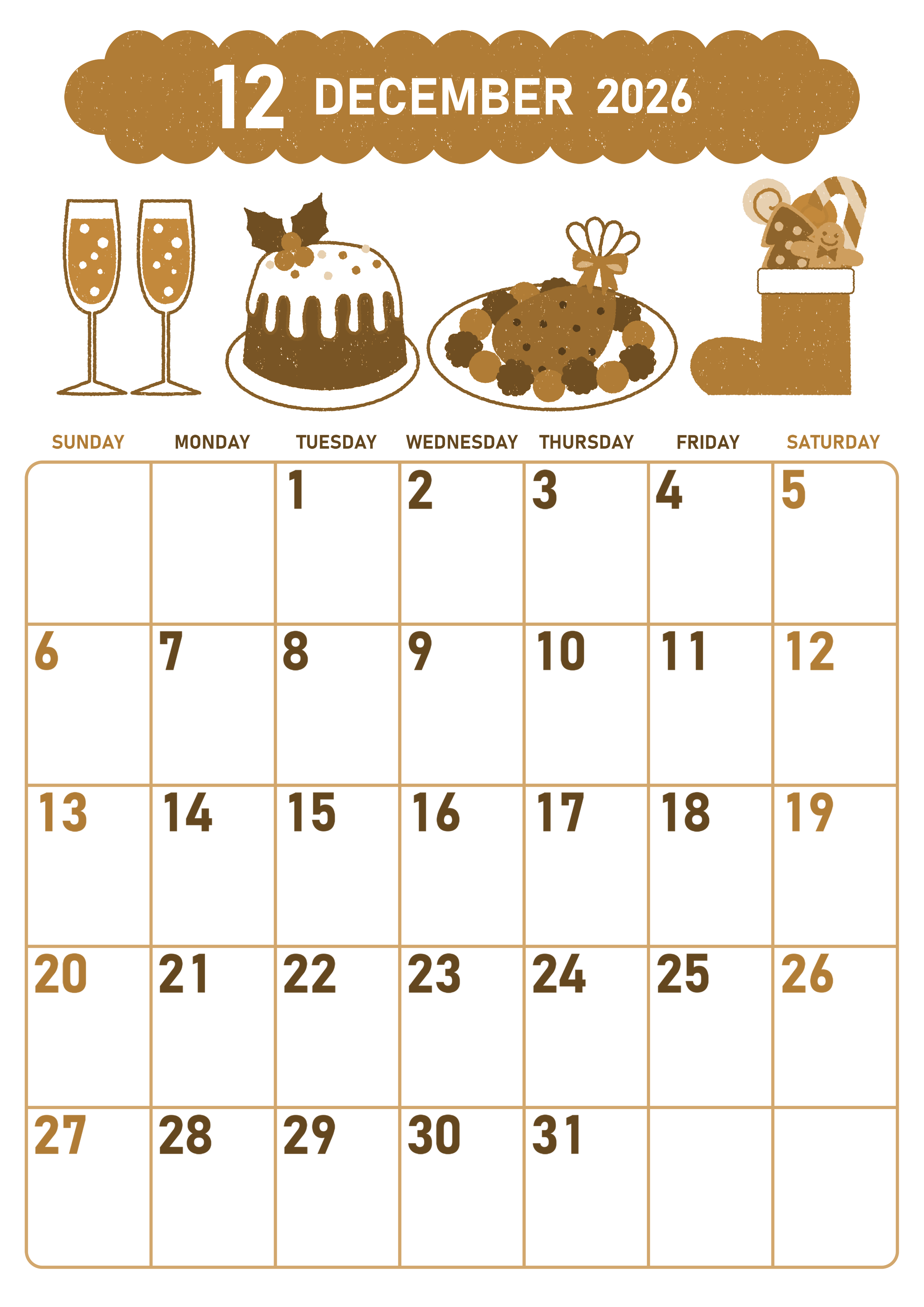 2026年12月縦型レトロな日曜始まりの無料テンプレートセピア調カレンダーです。七面鳥やケーキといった御馳走をかわいいテイストで描いたイラストです。罫線もしっかり引かれていて余白もたっぷりなので便利です。(2026-00681210)