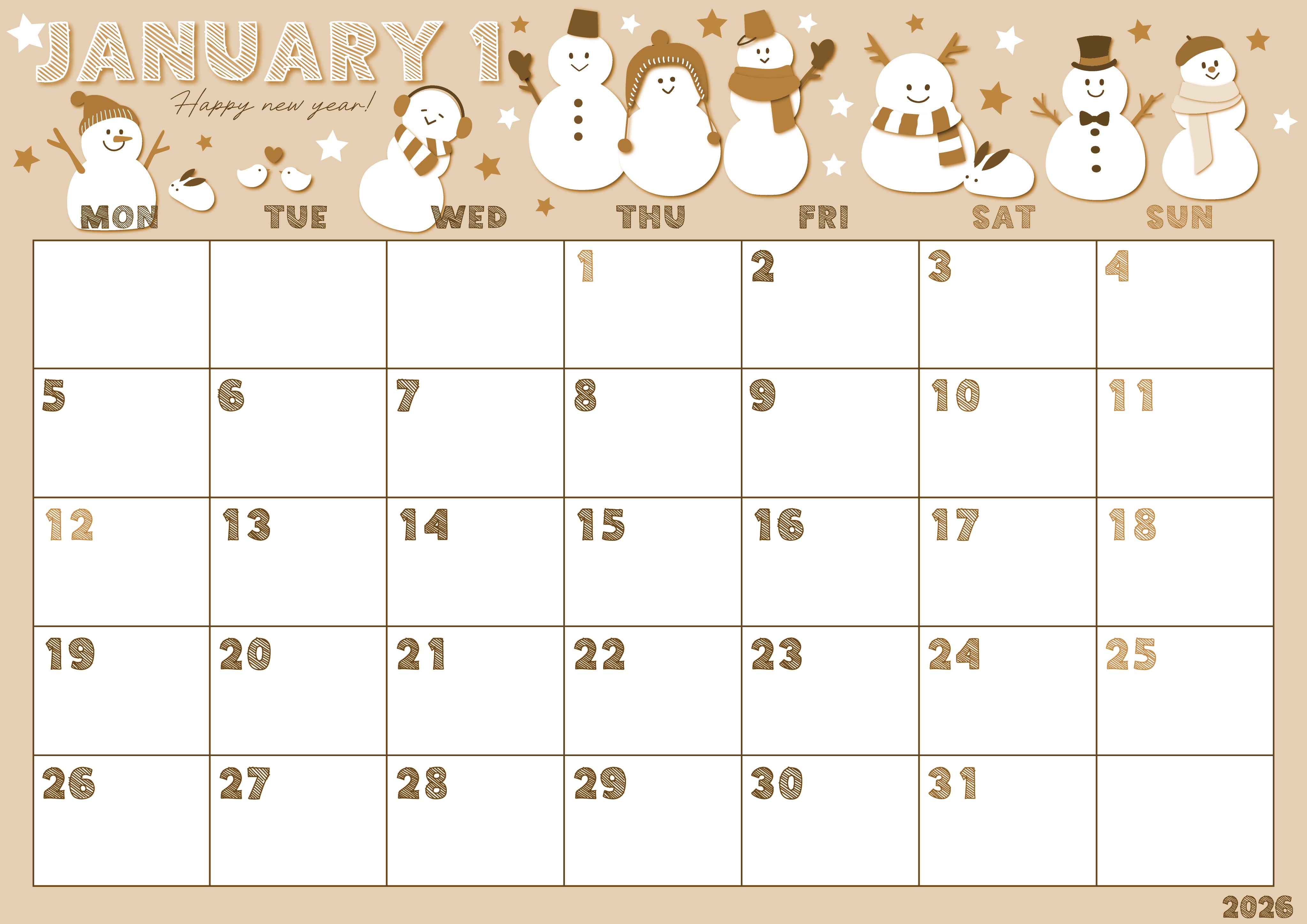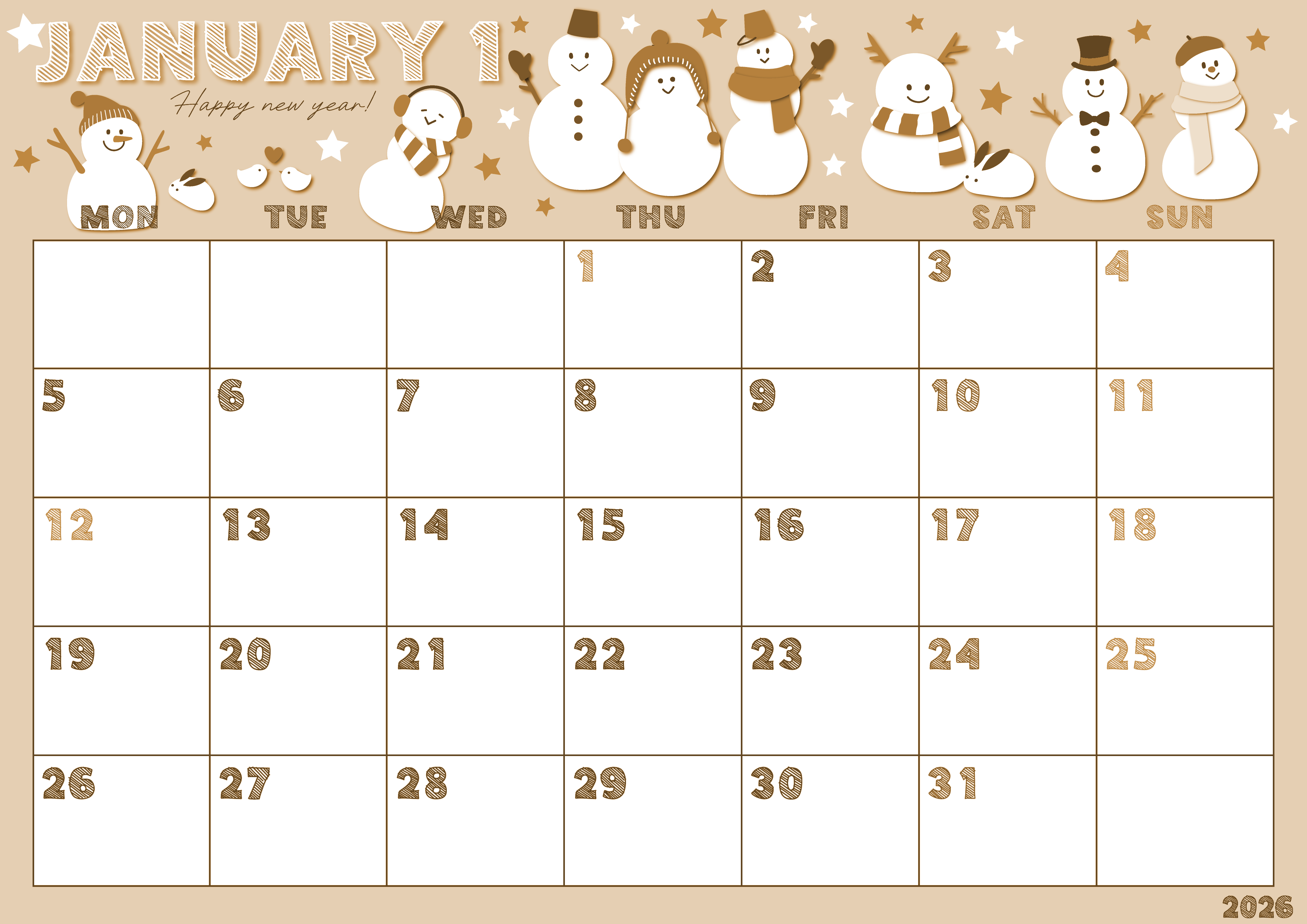 2026年1月横型レトロな月曜始まりセピア調カレンダーです。うさぎのスノウマンや小鳥のスノウマンやスタンダードなスノウマンと多種多様で賑やかなイラストです。ライトブルーを基調にしたでかわいいフォーマットで文字もポップで見やすいセピア調カレンダーです。(2026-00690101)