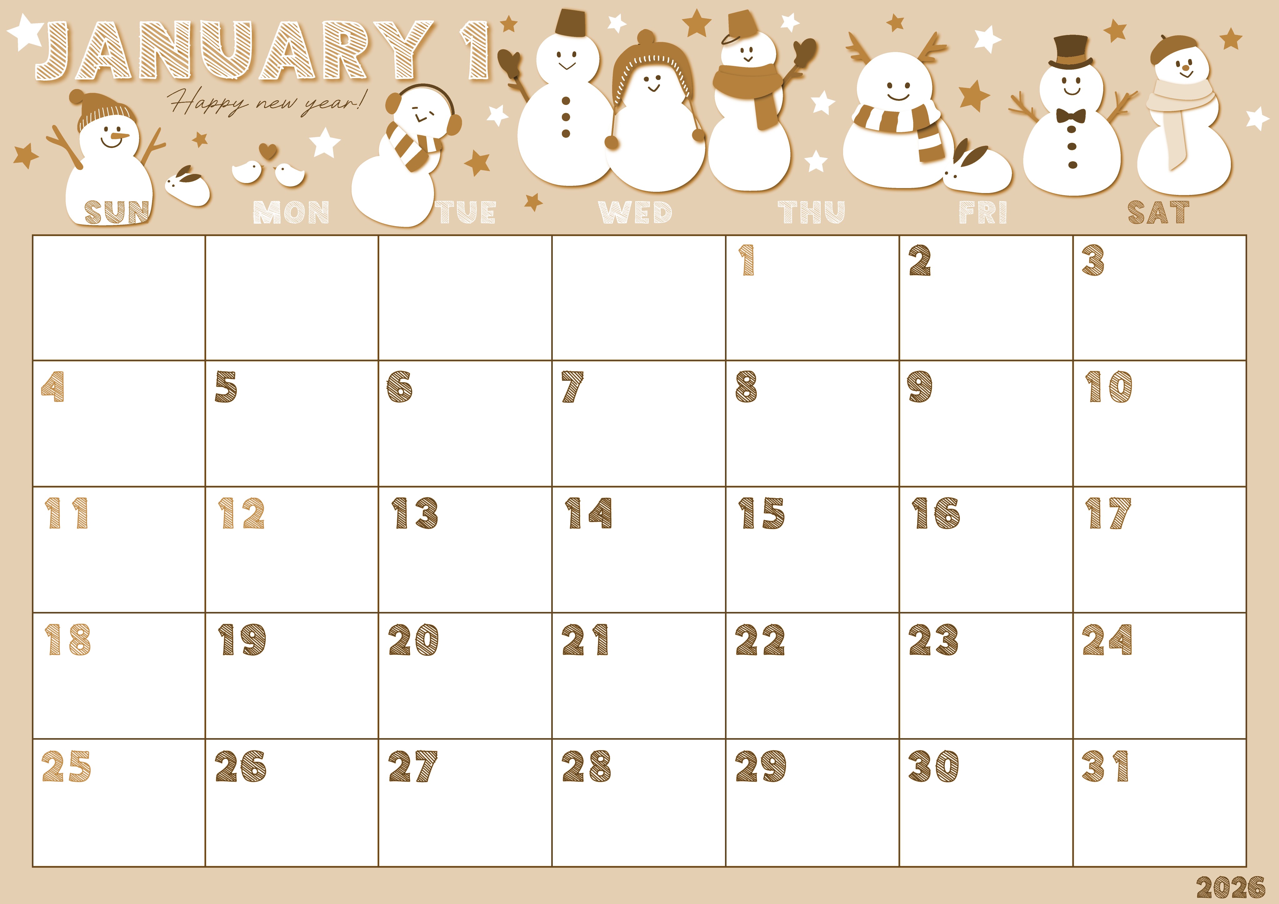2026年1月横型レトロな日曜始まりセピア調カレンダーです。マフラーを巻いたりトナカイのコスプレをしたり耳当てをしたり様々な雪だるまのイラストがポップでかわいいフォーマットです。文字もシマシマでかわいいセピア調カレンダーです。(2026-00690100)