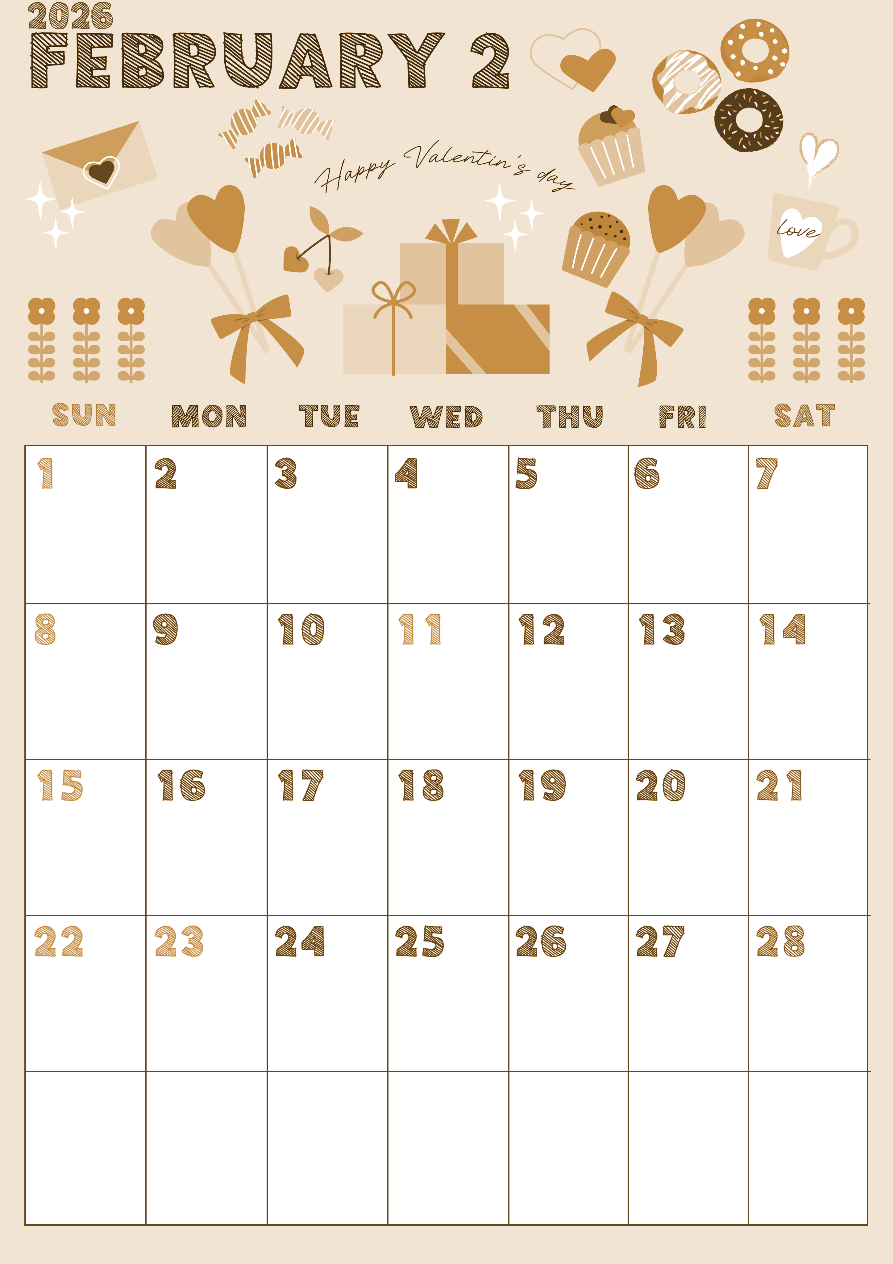2026年2月縦型レトロな日曜始まり かわいいバレンタインイラストA4無料セピア調カレンダー(2026-00690210)