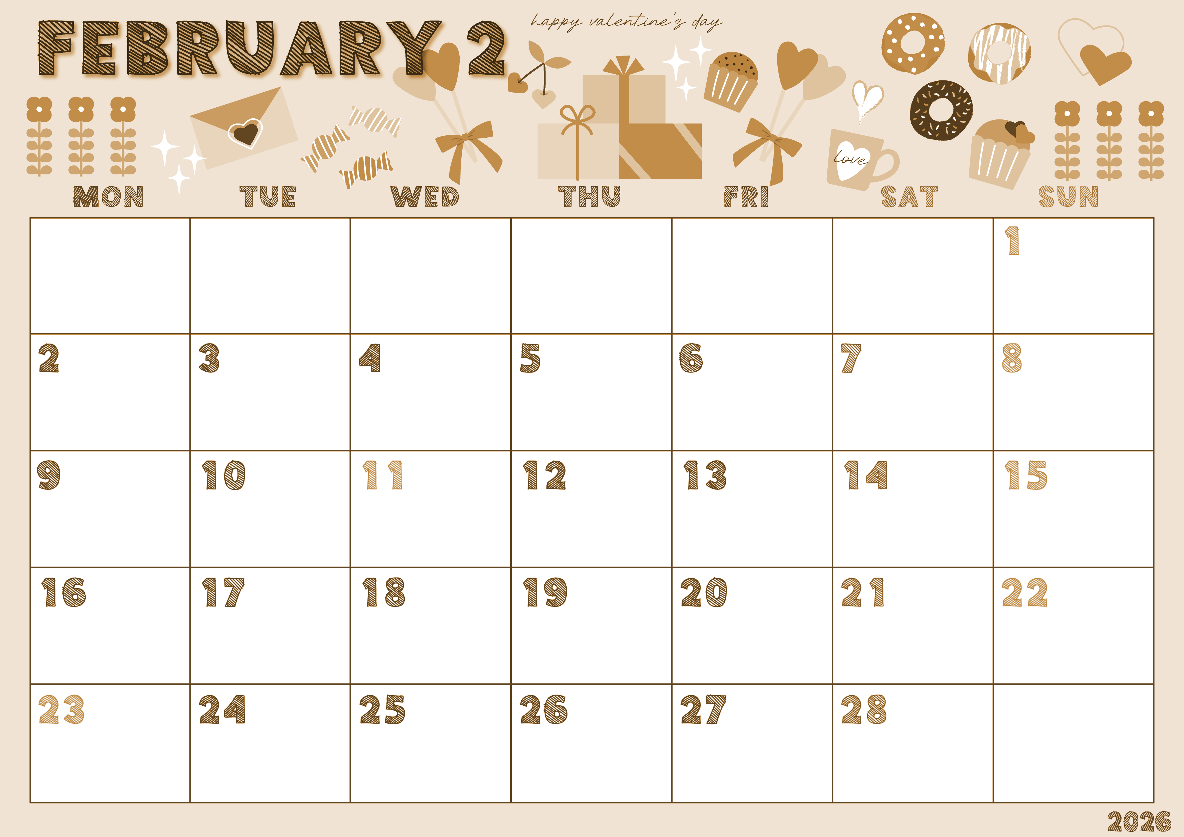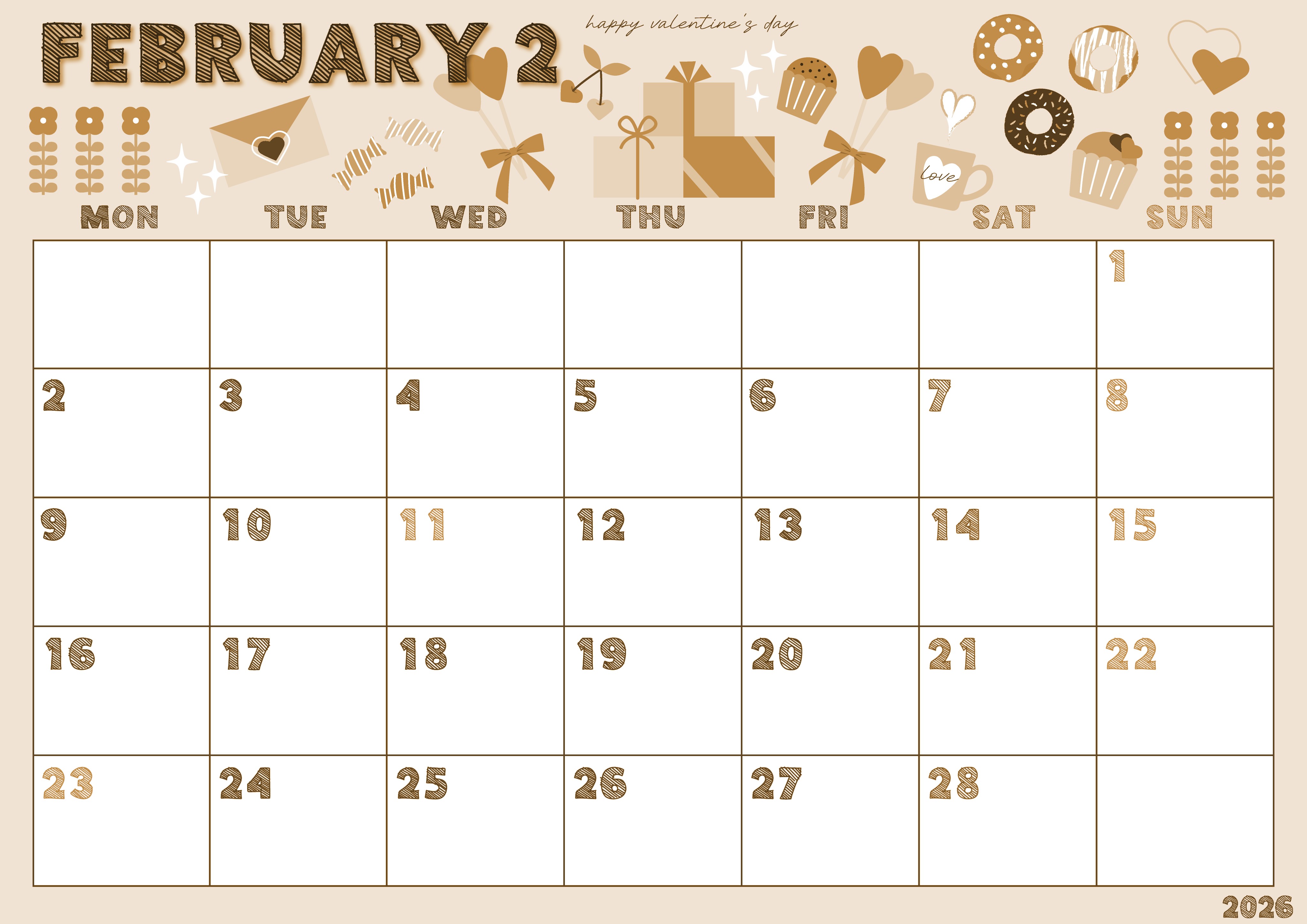 2026年2月横型レトロな月曜始まりセピア調カレンダーです。2月とFebruaryの文字はよく見ると細かいシマシマでまるでクレヨンで描いたような細かいデザインに目を惹かれるセピア調カレンダーです。たくさん描かれているアイテムもガーリーでかわいいです。(2026-00690201)