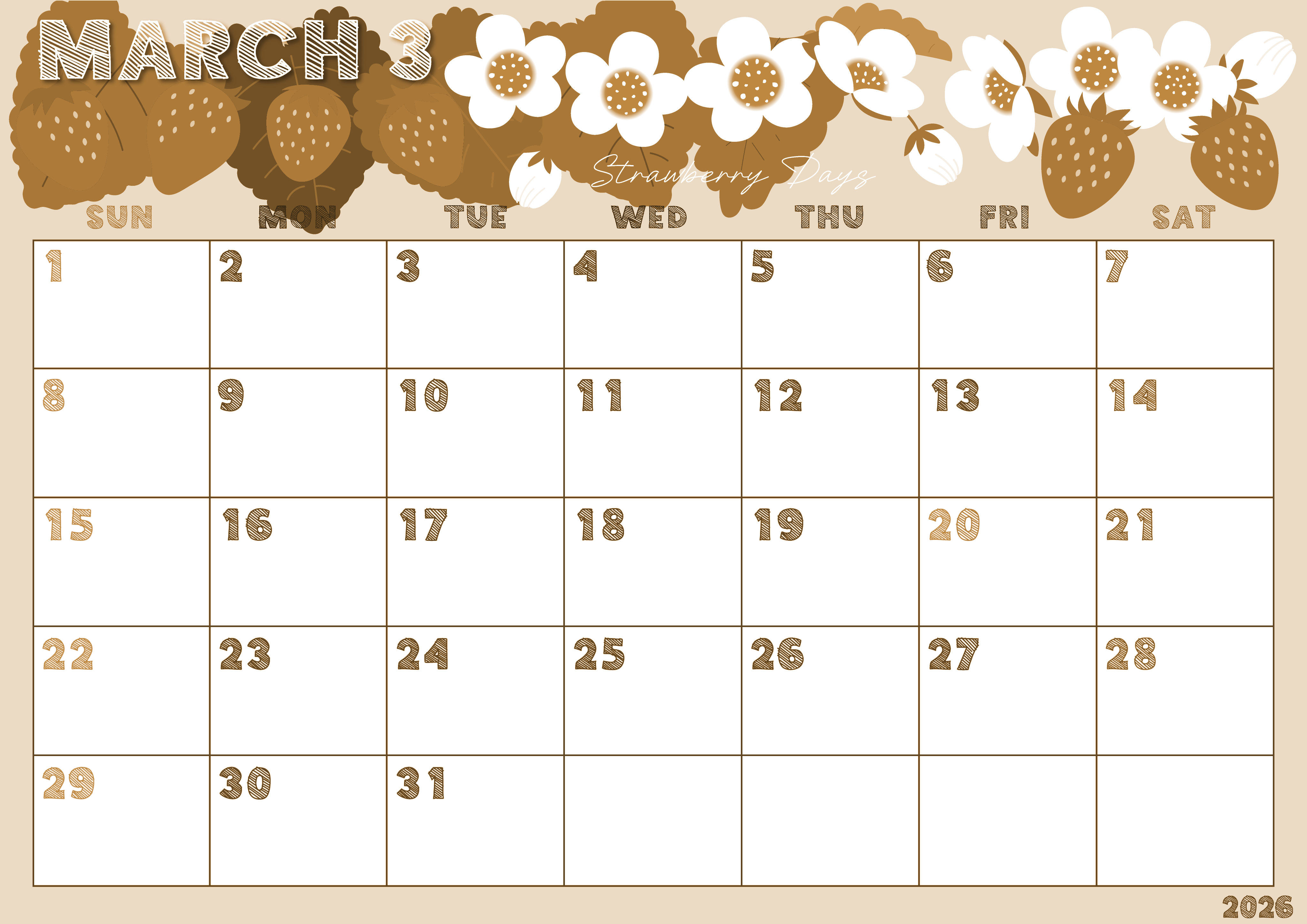 2026年3月横型レトロな日曜始まりの無料テンプレートセピア調カレンダーです。苺の白い花がかわいいイラストのセピア調カレンダーです。サイズはA4で横向きのレイアウトなのでスケジュールを沢山書き込めるフォーマットとなっています。(2026-00690300)