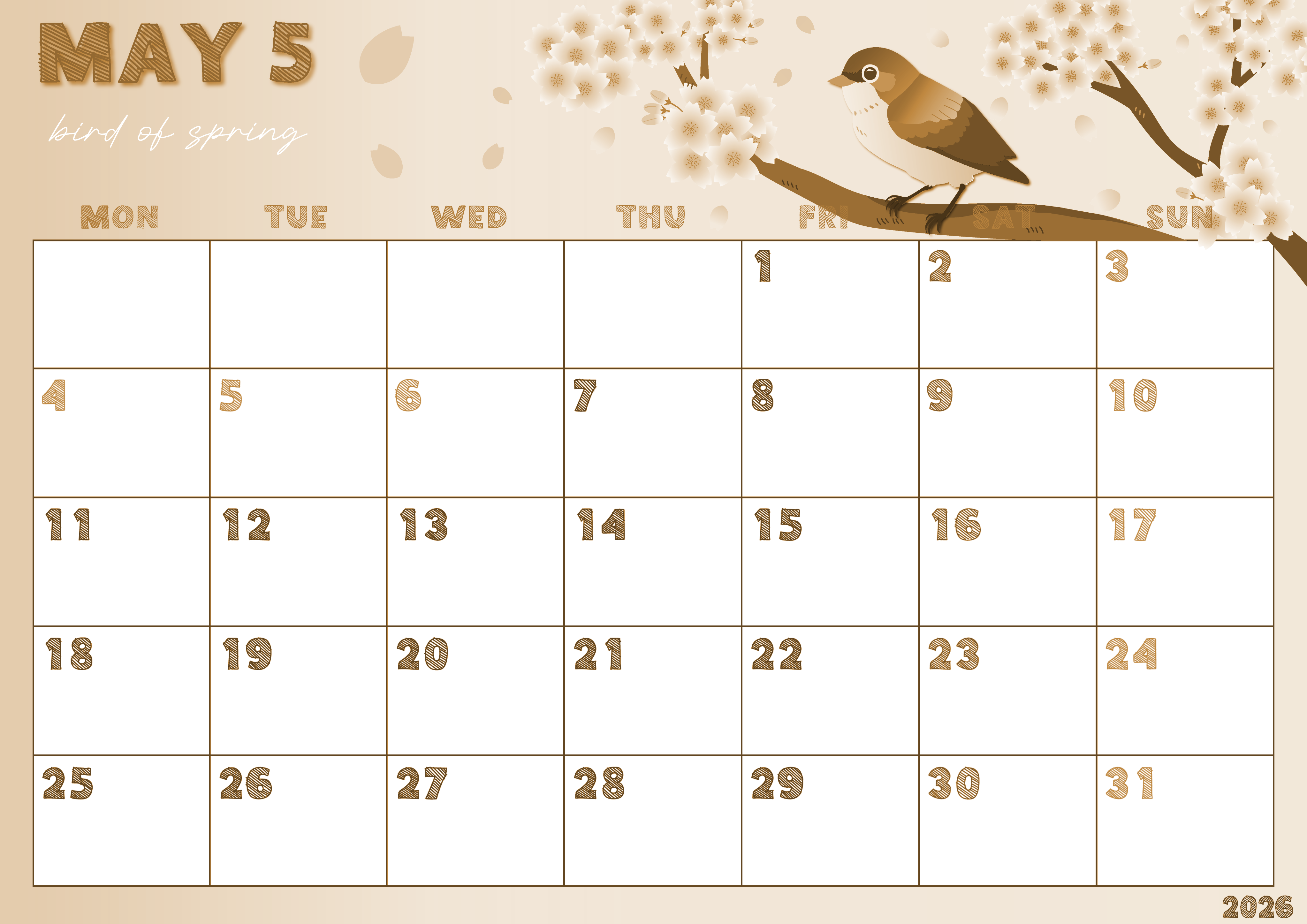 2026年5月横型レトロな月曜始まりの無料テンプレートセピア調カレンダーです。月曜始まりセピア調カレンダーになじみがあるという人におすすめしたい鶯と桜のイラストが生命力を感じさせるかわいいデザインのレイアウトです。(2026-00690501)