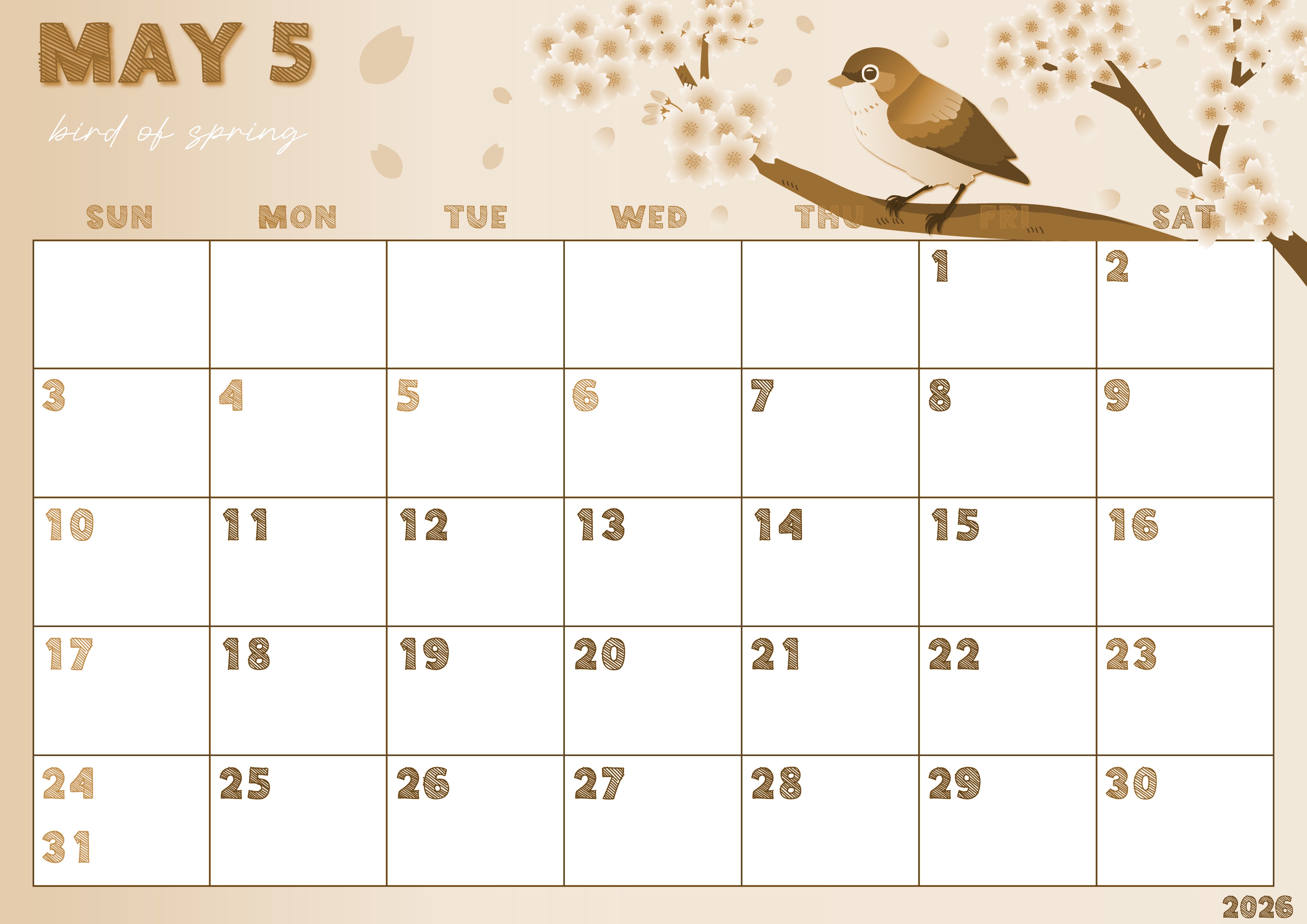 2026年5月横型レトロな日曜始まりの無料テンプレートセピア調カレンダーです。つぶらな瞳の鶯が満開の桜の木とマッチしているかわいいイラストです。セピア調カレンダーは大きめなので予定の書き込みがしやすいフリー素材です。(2026-00690500)