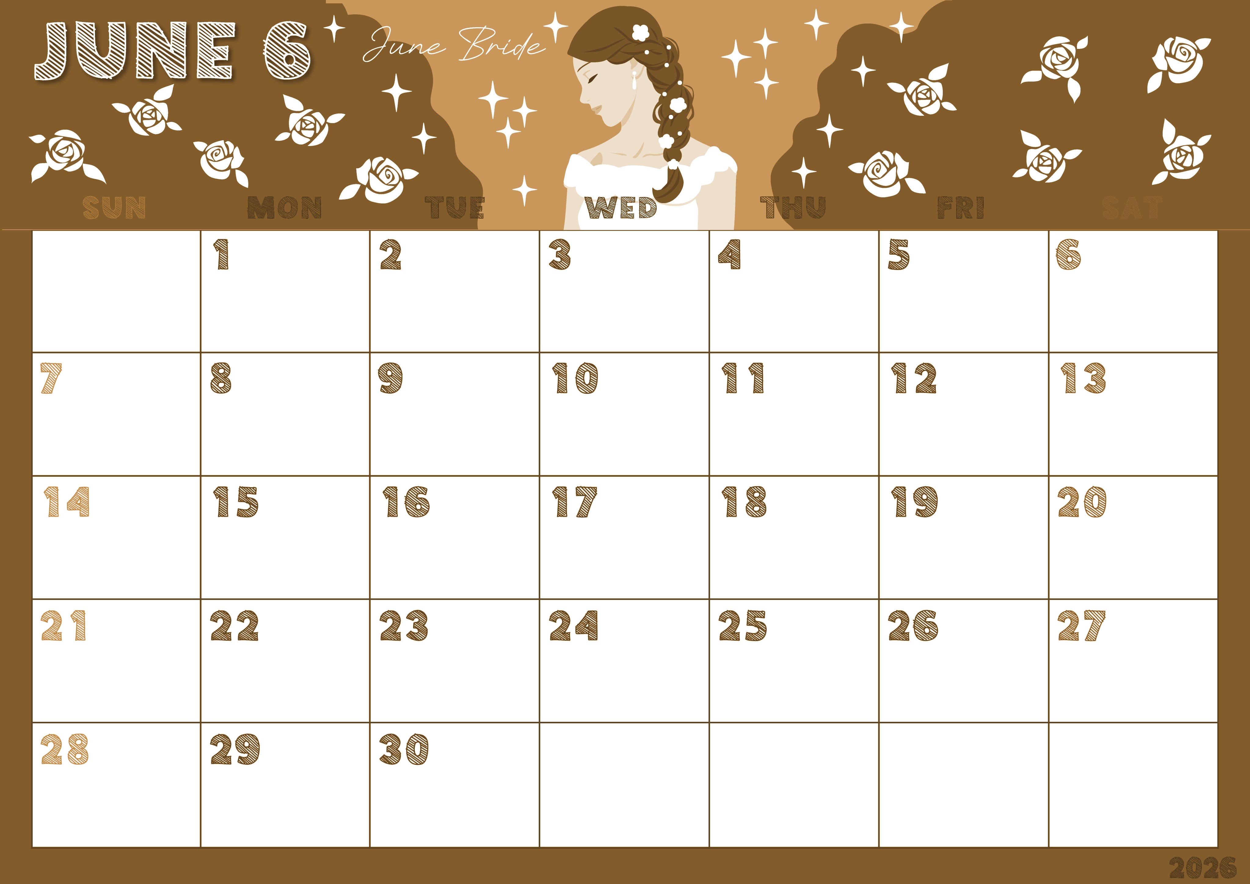2026年6月横型レトロな日曜始まりの無料テンプレートセピア調カレンダーです。背景に白薔薇がちりばめられていて中心に美人な乙女が描かれているかわいいイラストのセピア調カレンダーは無料で印刷するだけですぐに使えます。(2026-00690600)