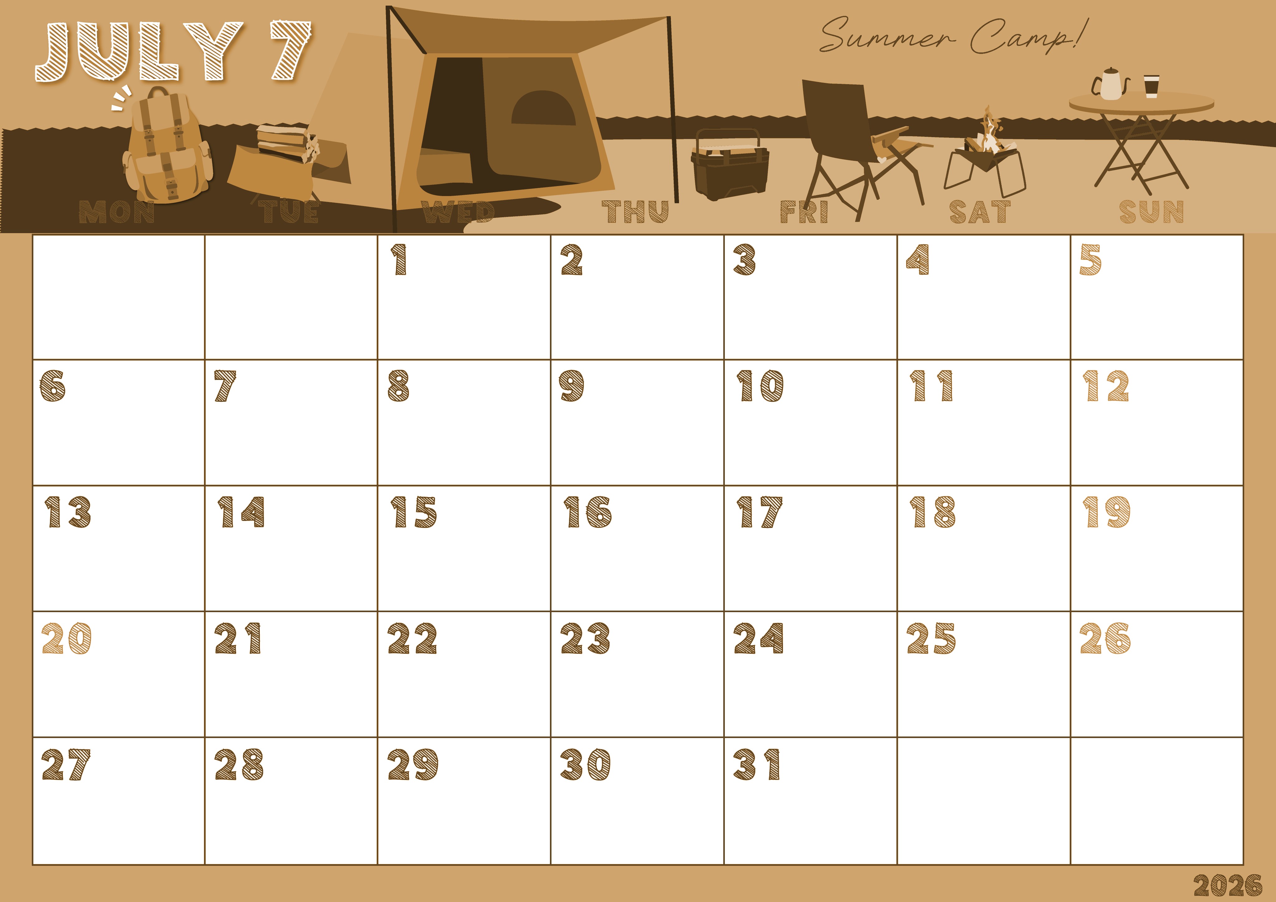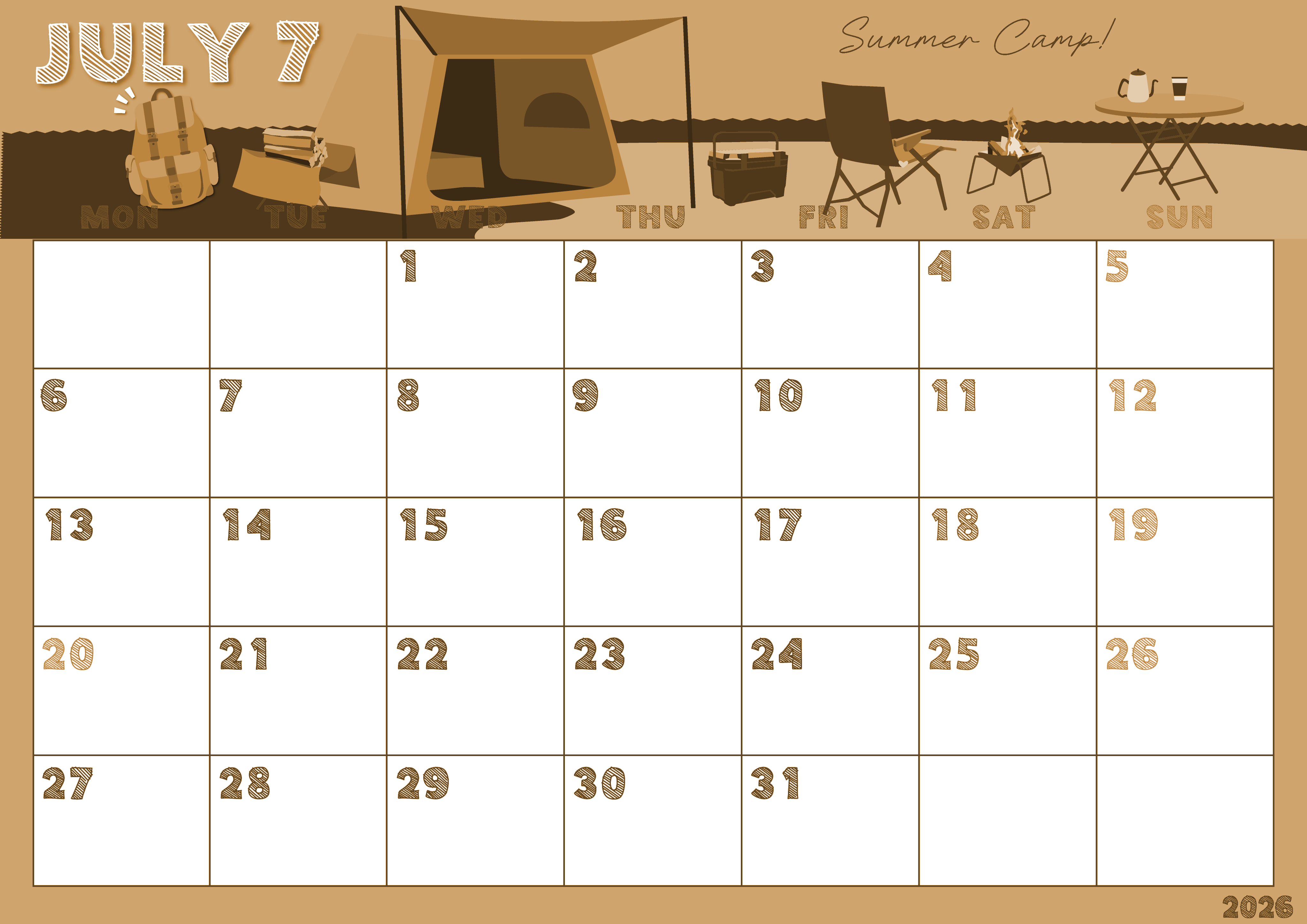 2026年7月横型レトロな月曜始まりの無料テンプレートセピア調カレンダーです。忙しい夏休みの行事を把握するのに適している月曜始まりで曜日によって文字が色分けされたユーザビリティの高いイラストもかわいいセピア調カレンダーです。(2026-00690701)