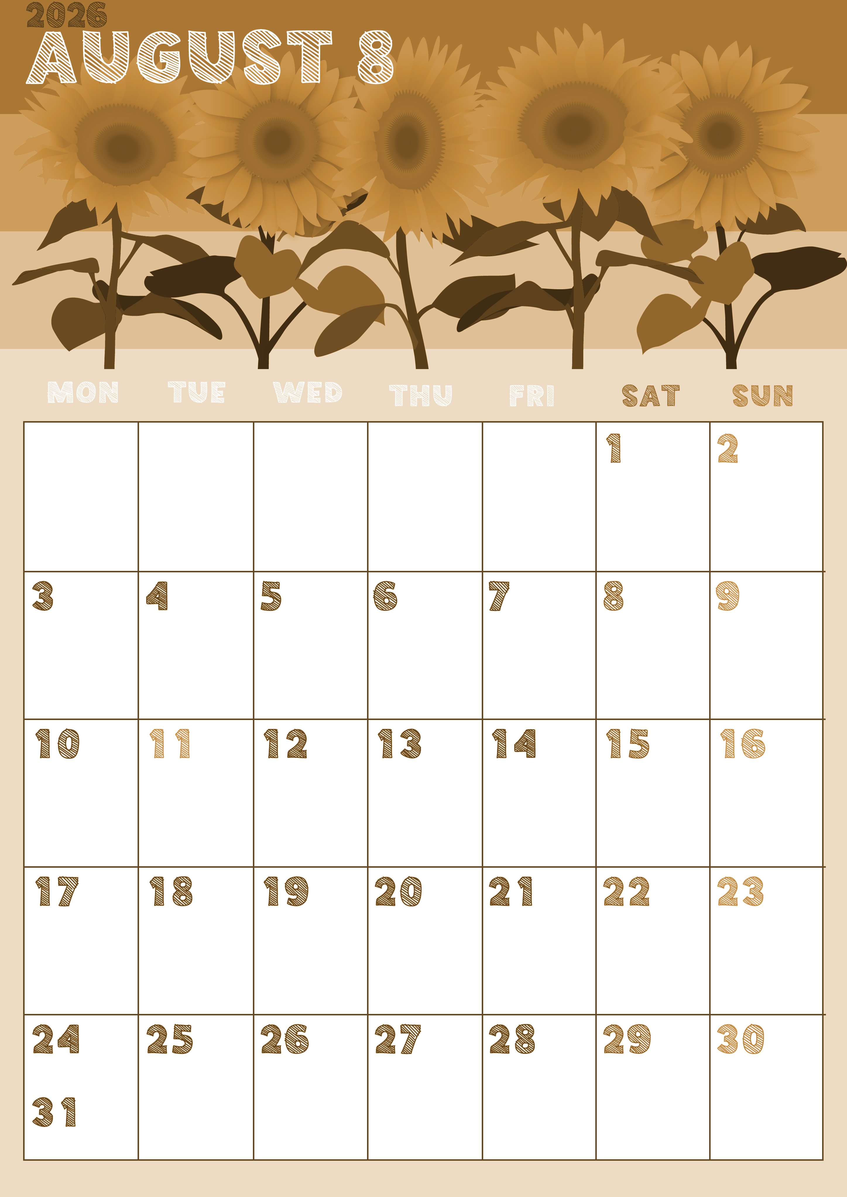 2026年8月縦型レトロな月曜始まりの無料テンプレートセピア調カレンダーです。セピア調カレンダーは月曜始まりだと決めているという人におすすめの夏らしいかわいいイラストが「8月を充実させよう」という気持ちにさせてくれるセピア調カレンダーです。(2026-00690811)