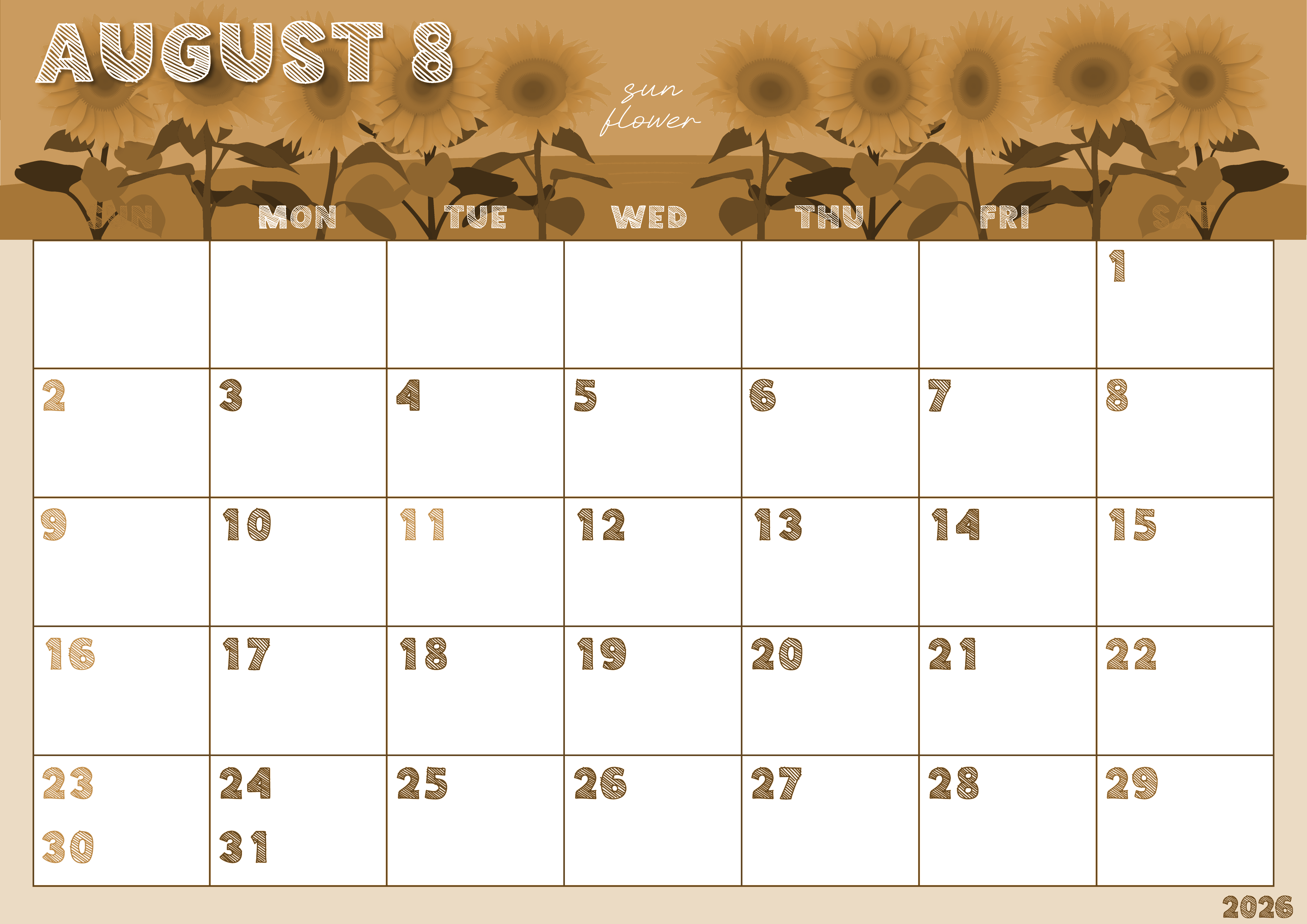2026年8月横型レトロな日曜始まりの無料テンプレートセピア調カレンダーです。大量のヒマワリが一生懸命に咲き誇っているイラストにクレヨンで描いたような8月とAugustの文字が夏らしいかわいいセピア調カレンダーです。(2026-00690800)