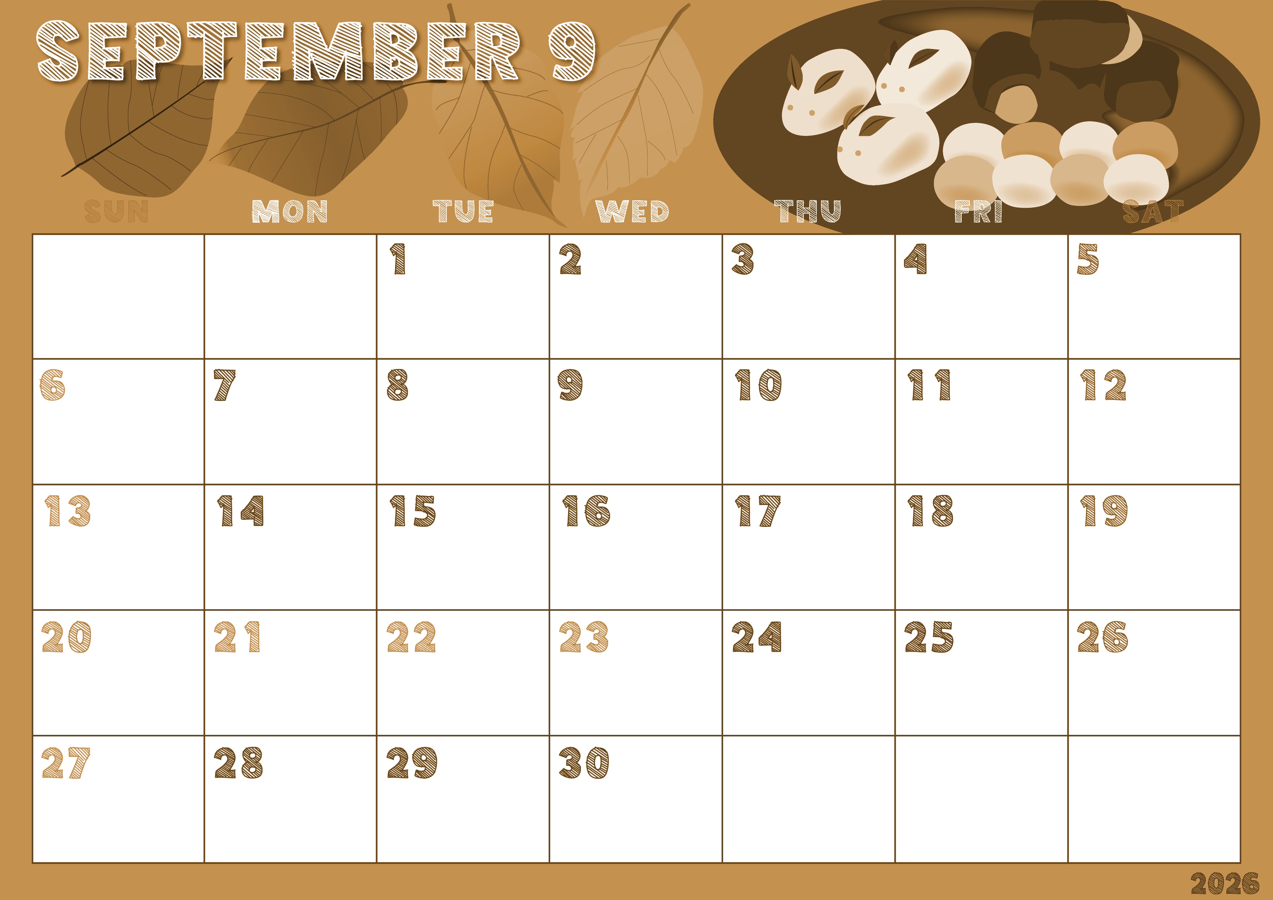 2026年9月横型レトロな日曜始まりの無料テンプレートセピア調カレンダーです。シックな背景にいろいろな食欲をそそるような和菓子イラストがとてもかわいいイラスト素材です。(2026-00690900)