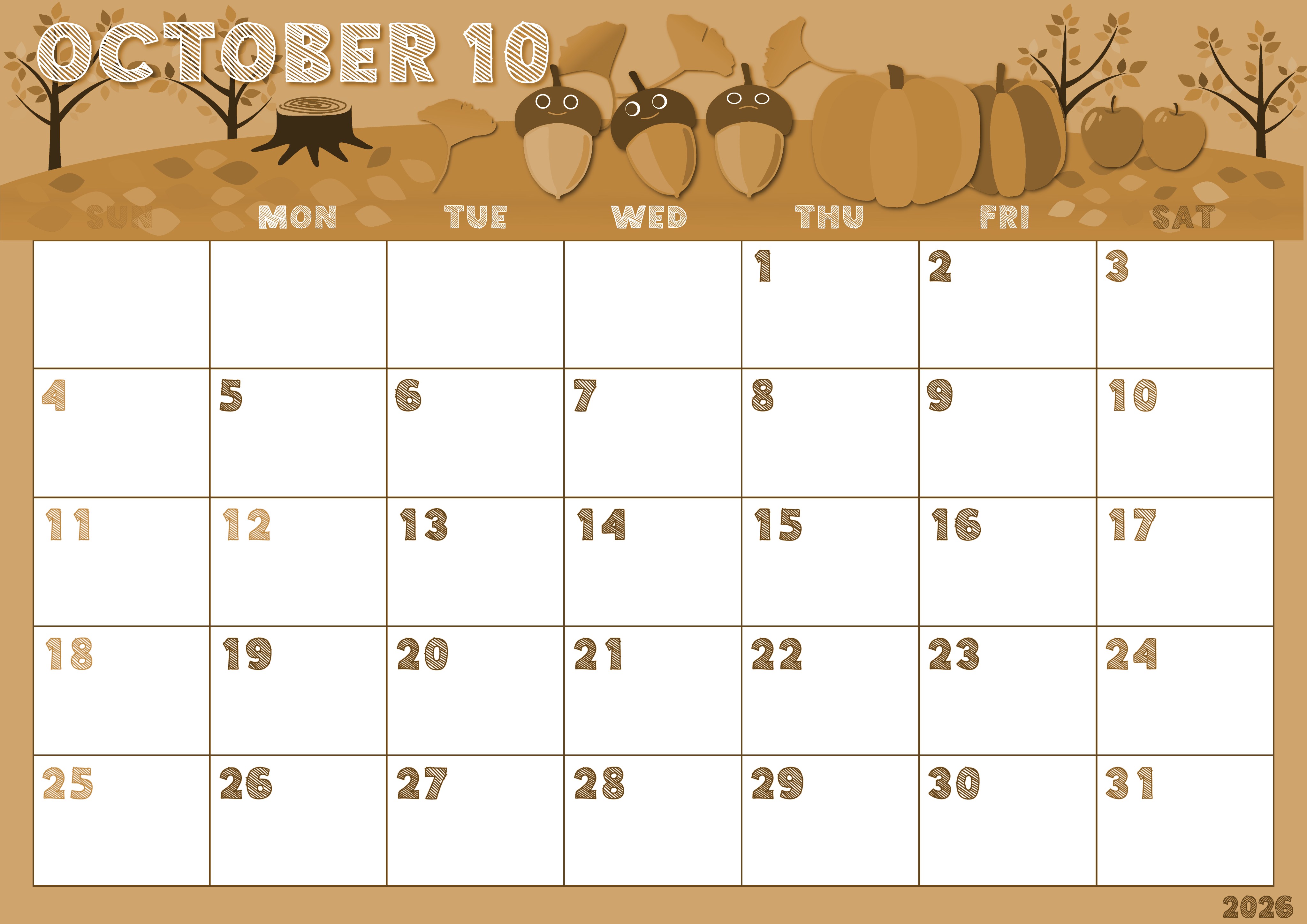 2026年10月横型レトロな日曜始まりの無料テンプレートセピア調カレンダーです。瞳がくりくりしているどんぐりがかわいい秋の季節をテーマにした世界観に引き込まれるイラストとなっています。カボチャやリンゴも描かれています。(2026-00691000)